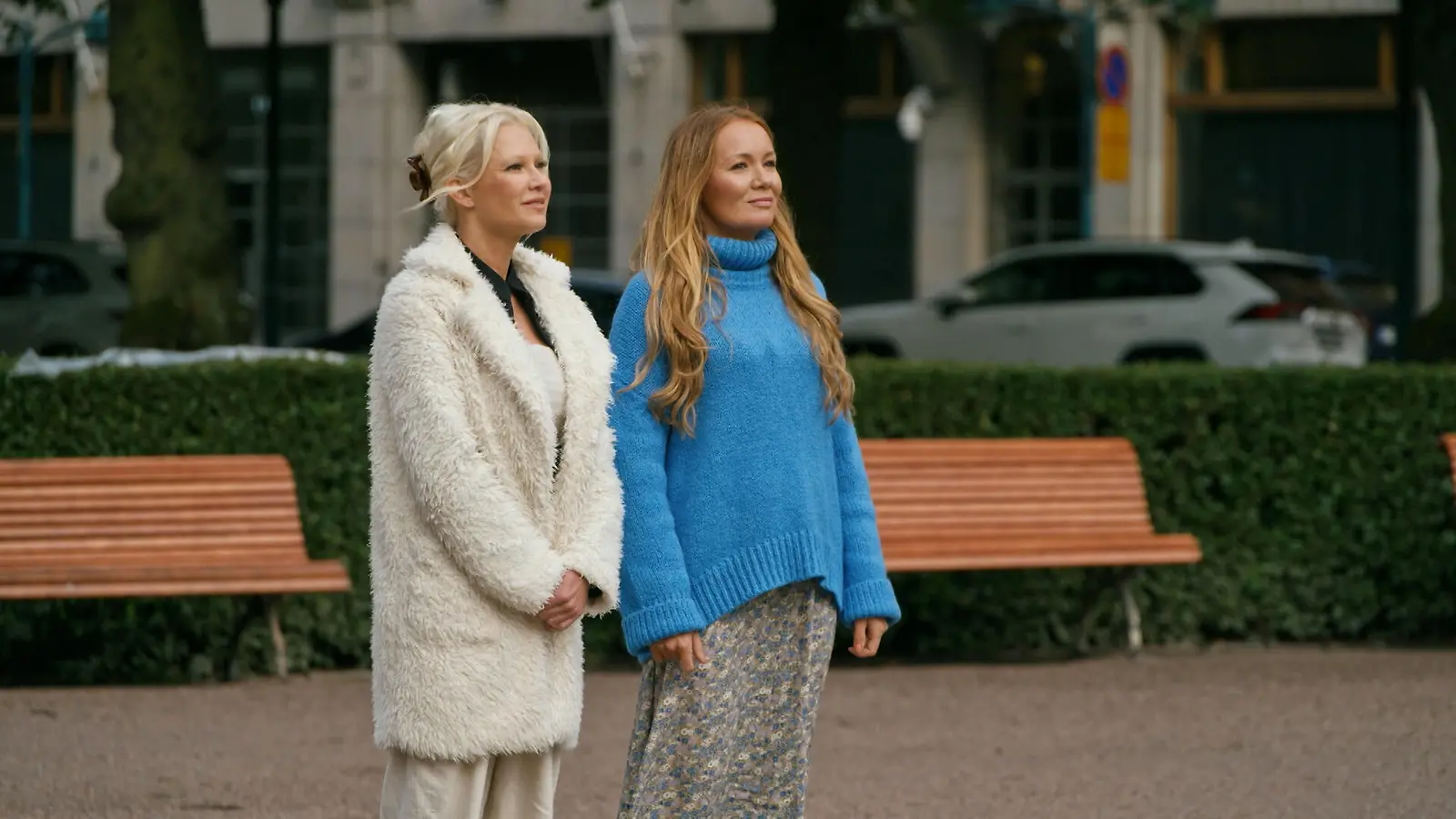 Linda Lampenius fiilistelee yhdessä ohjelman juontajan, Marja Hintikan, kanssa. Kuva: MTV3