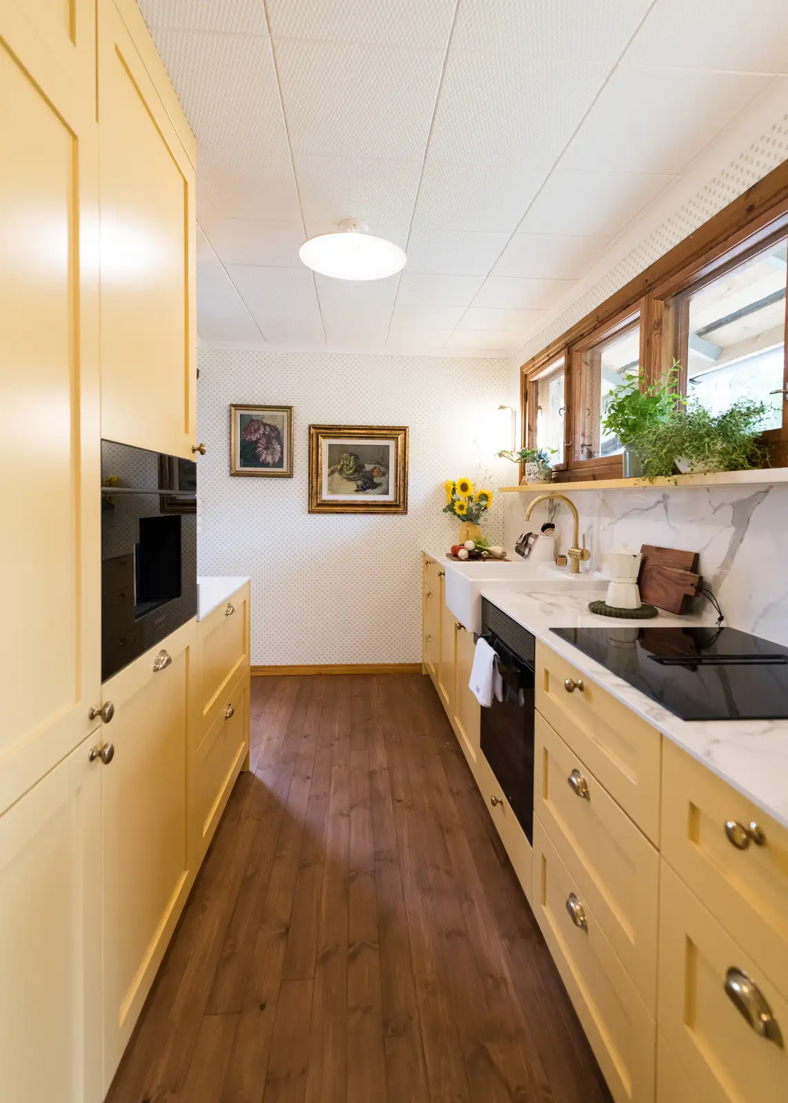 Uudessa keittiössä on uusi lattia, keittiö hehkuu keltaisena ja sinne oli saatu istutettua kaikki tarvittavat kodinkoneet. Kuva: MTV3