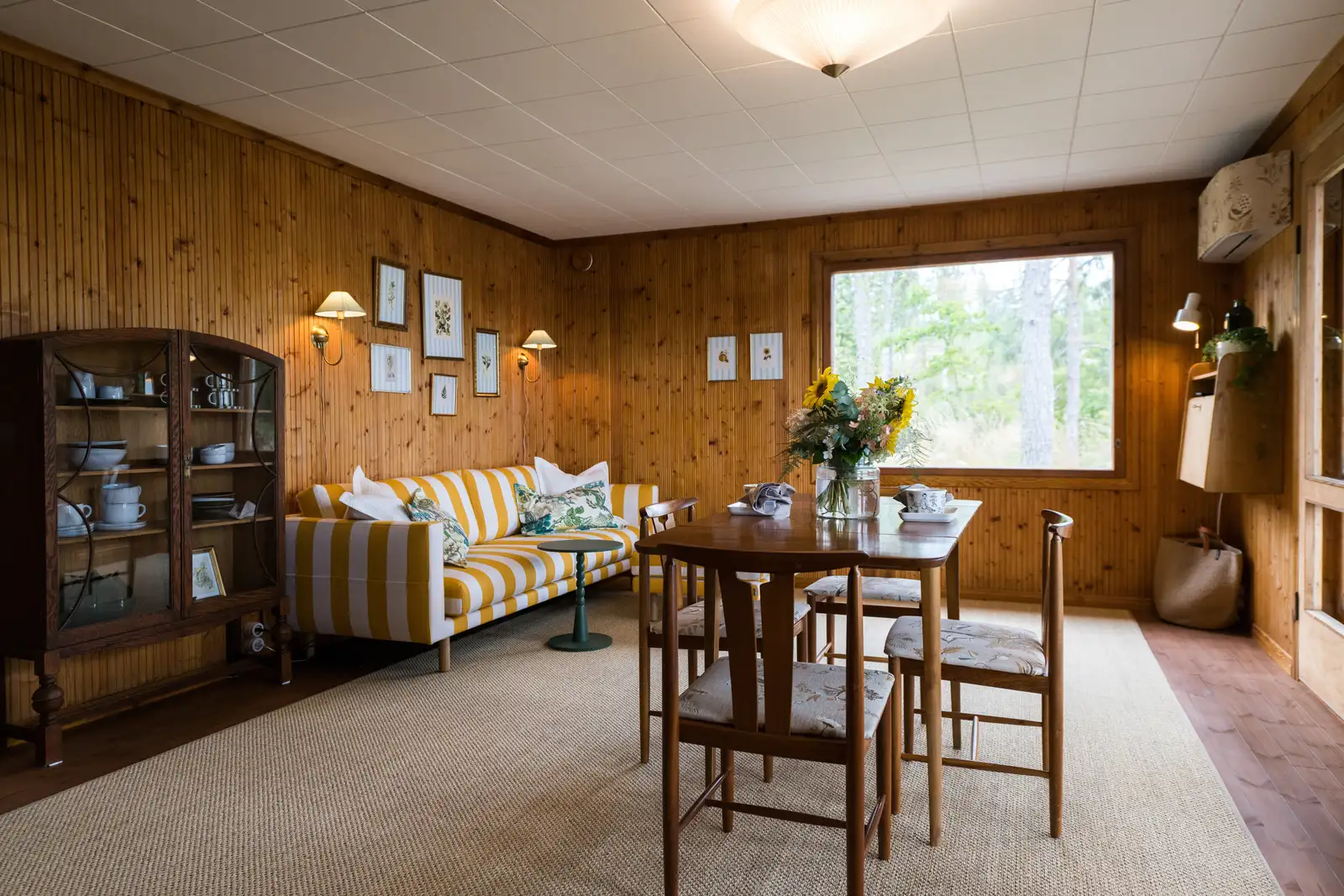 Mökkiin tuli isoimpina uudistuksina uusi lattia ja lattiarakenne, sähkötyöt sekä aivan uusi huonejärjestys. Kohteessa haluttiin säilyttää vanhaa niin paljon kuin mahdollista: seinissä pystyttiinkin säästämään vanhat sormipaneelit. Sisustuksessa luotettiin väreihin tekstiileissä ja tapeteissa.