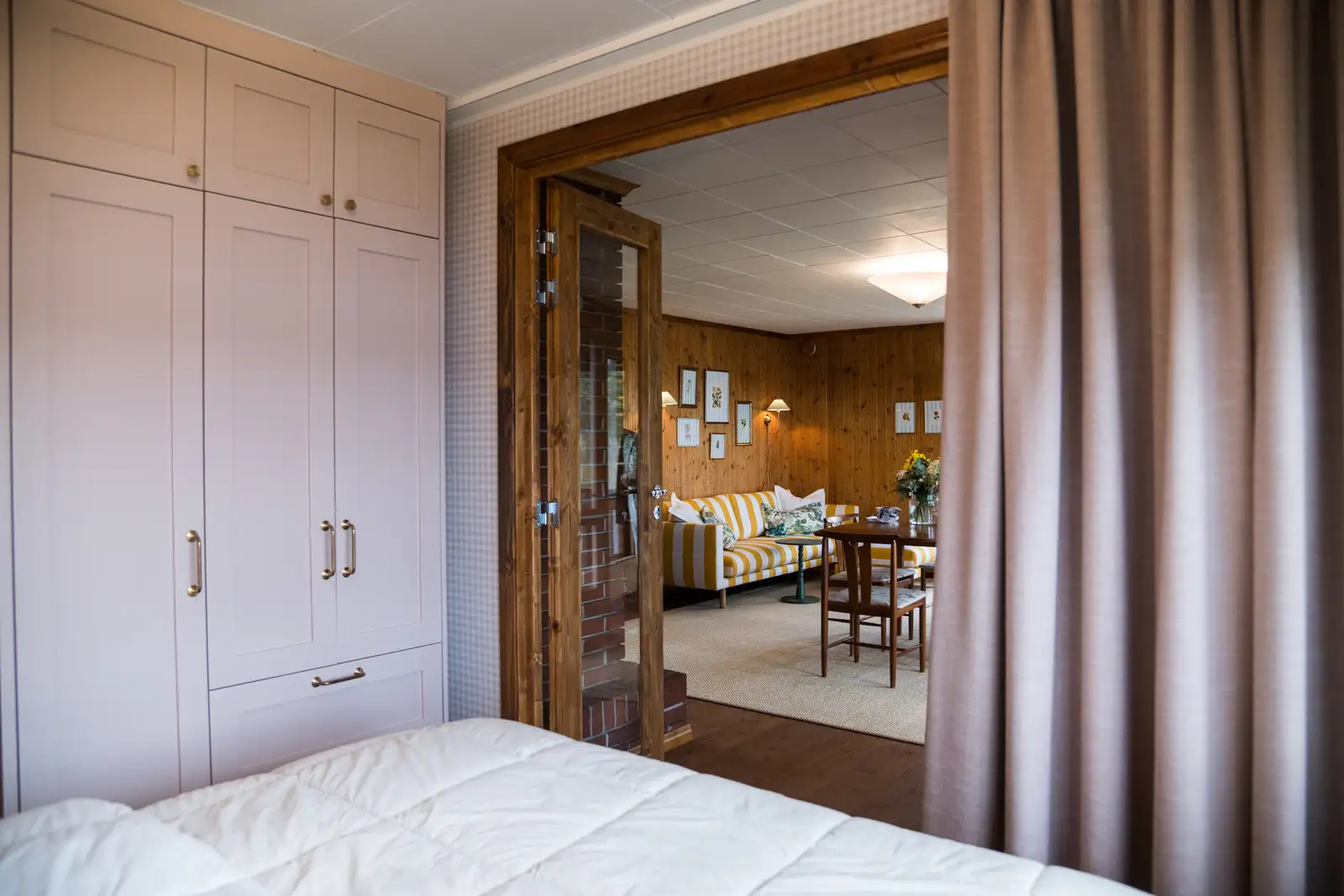 Makuuhuoneesta on näkymä olohuoneeseen ja huoneessa on runsaasti säilytystilaa. Kuva: MTV3