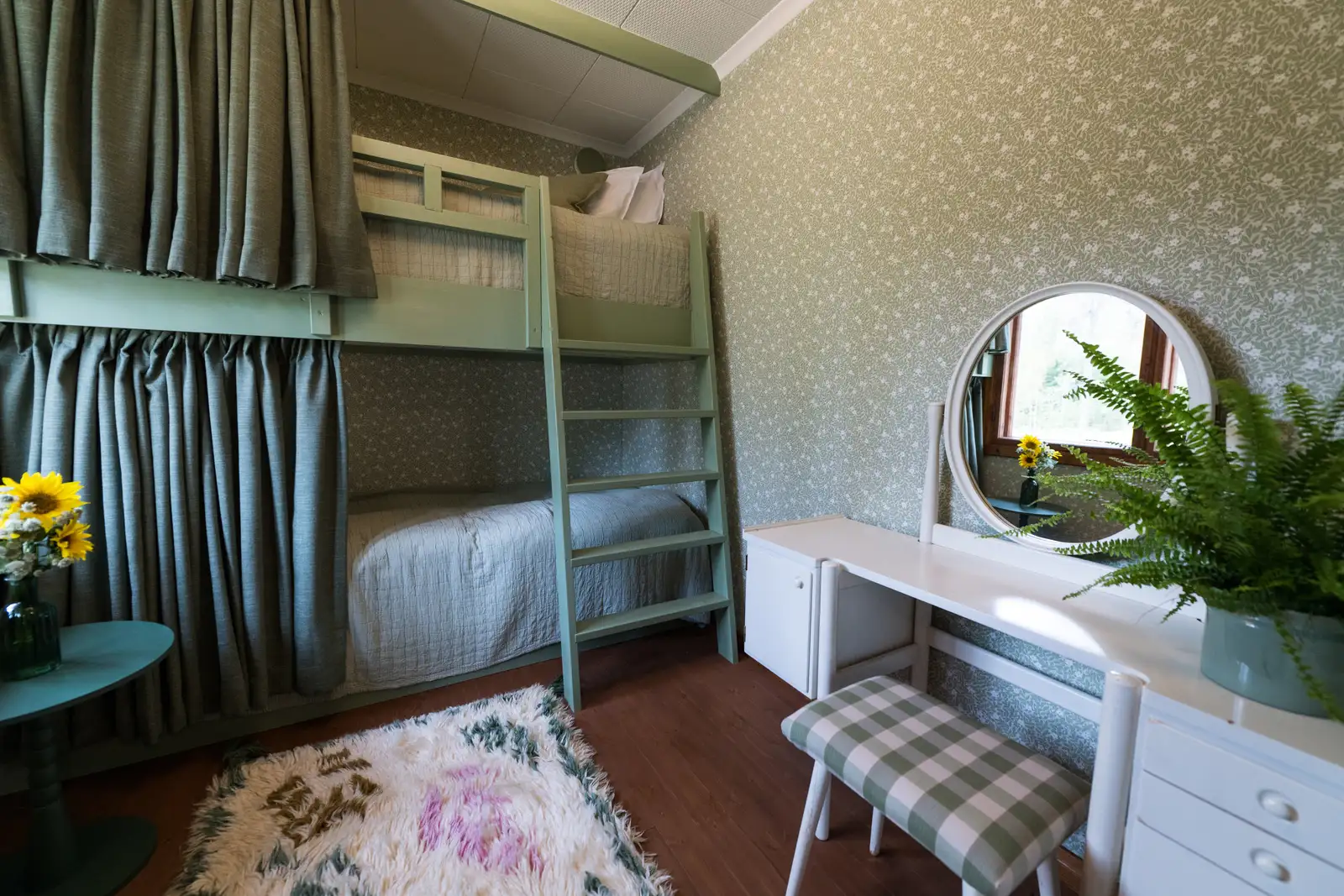 Kerrossänky sopii sekä lapsille että aikuisille. Yksityiskohtana verhot kummassakin sängyssä. Vihreäsävyiset sängyt ja tapetti ovat yhteensopivat. Kuva: MTV3