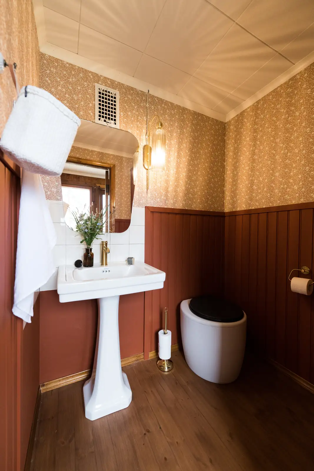 Vessassa on lämmin tunnelma, wc ei ole vedettävä. Vessassa säilytettiin alkuperäiset laatat. Kuva: MTV3