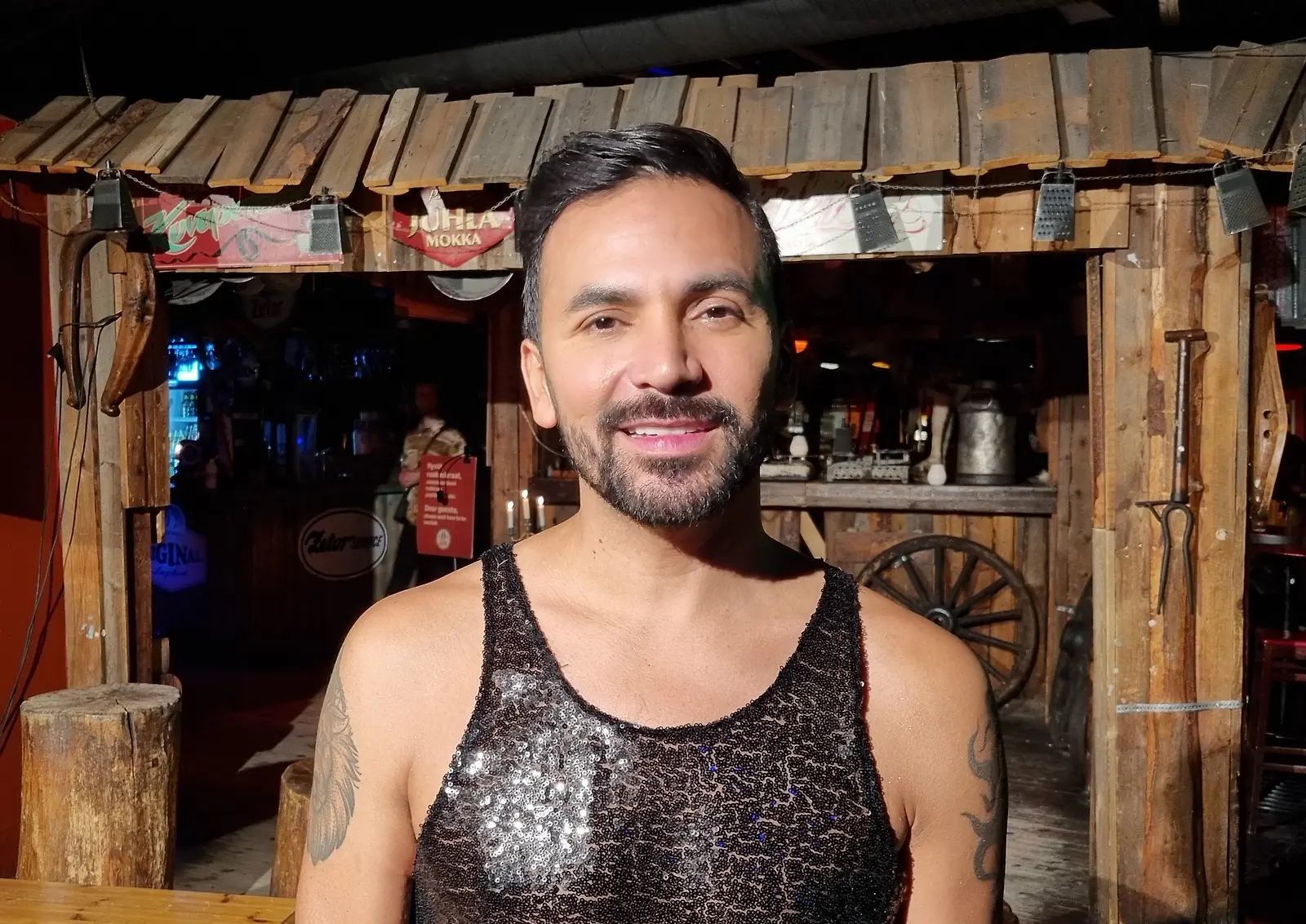 Flores on opiskellut parturi-kampaajaksi, media-assistentiksi ja stuertiksi. Hän oli pukeutunut Farmin lehdistötilaisuuteen hihattomaan glitter-paitaan. Kuva: K. Kurki