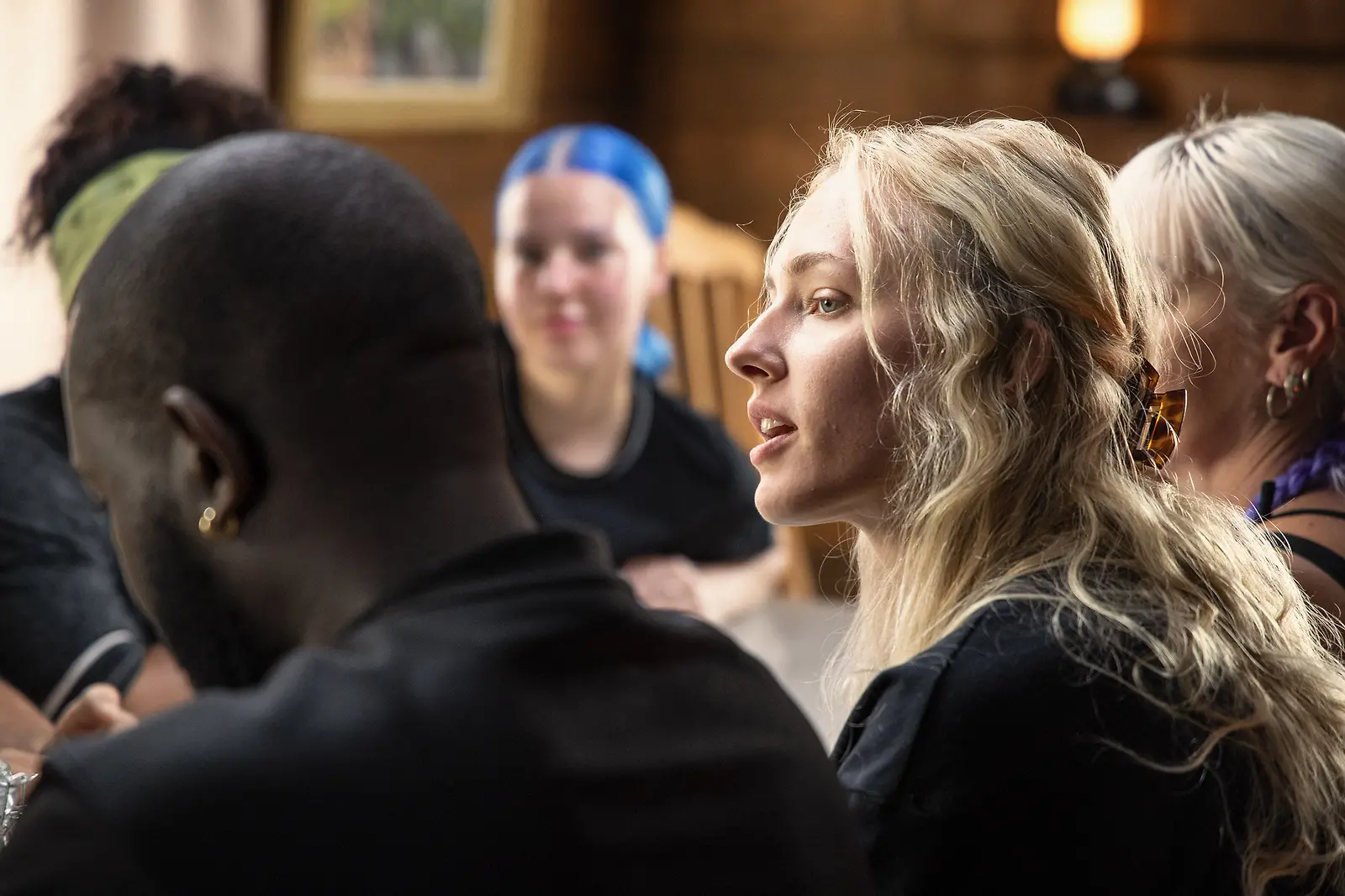 Miss Suomi Anni Harjunpää haastaa kaksintaisteluun sinisessä tukassaan pöydän ääressä istuvan Tuuli Oikarisen. Kuva: Nelonen