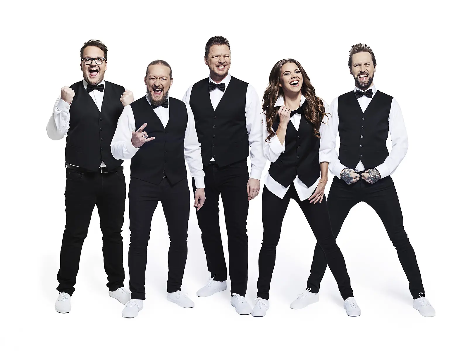Kalle Lamberg, Jarppi Leppälä, Jaakko Saariluoma, Viivi Pumpanen ja HP Parviainen viihdyttävät possentaina eli perjantaina. Kuva: MTV3