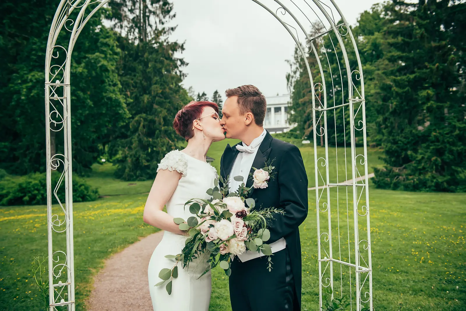 Vera ja Matti suukottavat kuvaajalle häätilaisuudessa. Kuva: MTV3