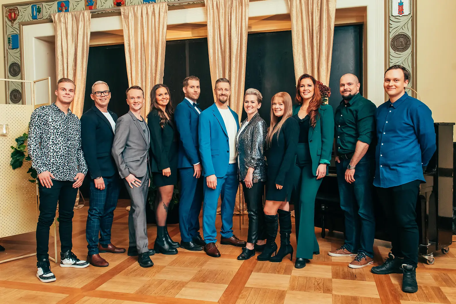 Ensitreffit 2.0 tyypit yhteiskuvassa: Jape, Janne, Eino, Emma, Rene, asiantuntijat Heikki Harju ja Essi Vauras, Tiia, Tilda, Petri ja Matti. Vera ei päässyt viimeiselle illalliselle sairastumisen vuoksi. Kuva: MTV3
