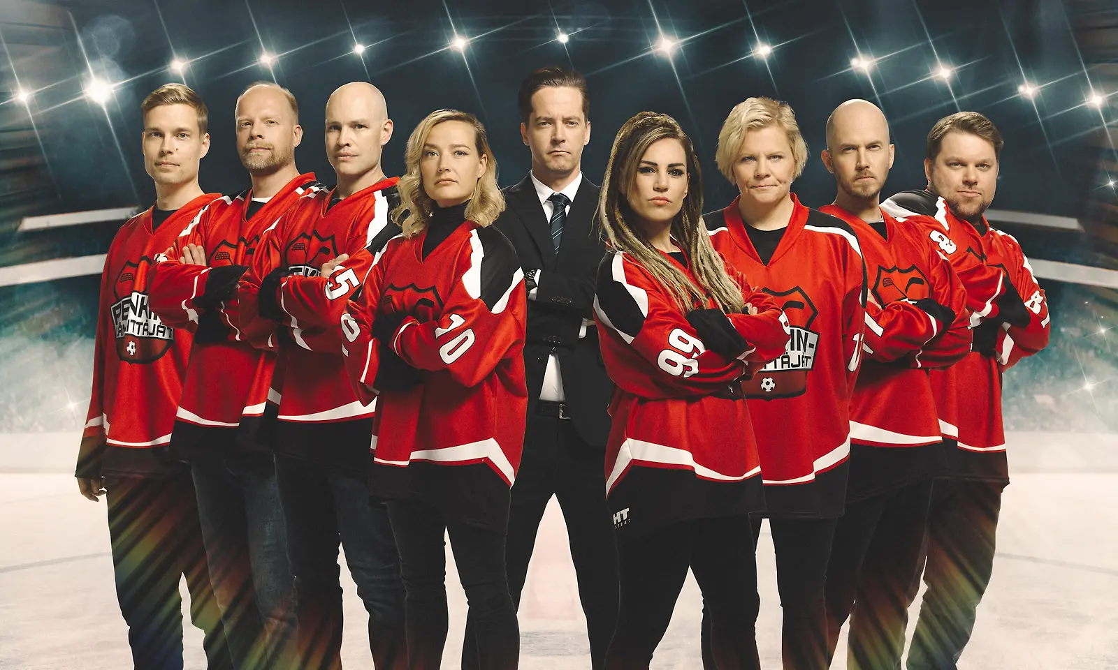 Penkinlämmittäjät: Tero Tiittanen, Ville Myllyrinne, Jarkko Ruutu, Pilvi Hämäläinen, Eva Wahlström, Paula Noronen, Tommy Lindgren ja Mikko Töyssy. Ohjelman juontaa Ilkka "Ile" Uusivuori. Kuva: MTV3