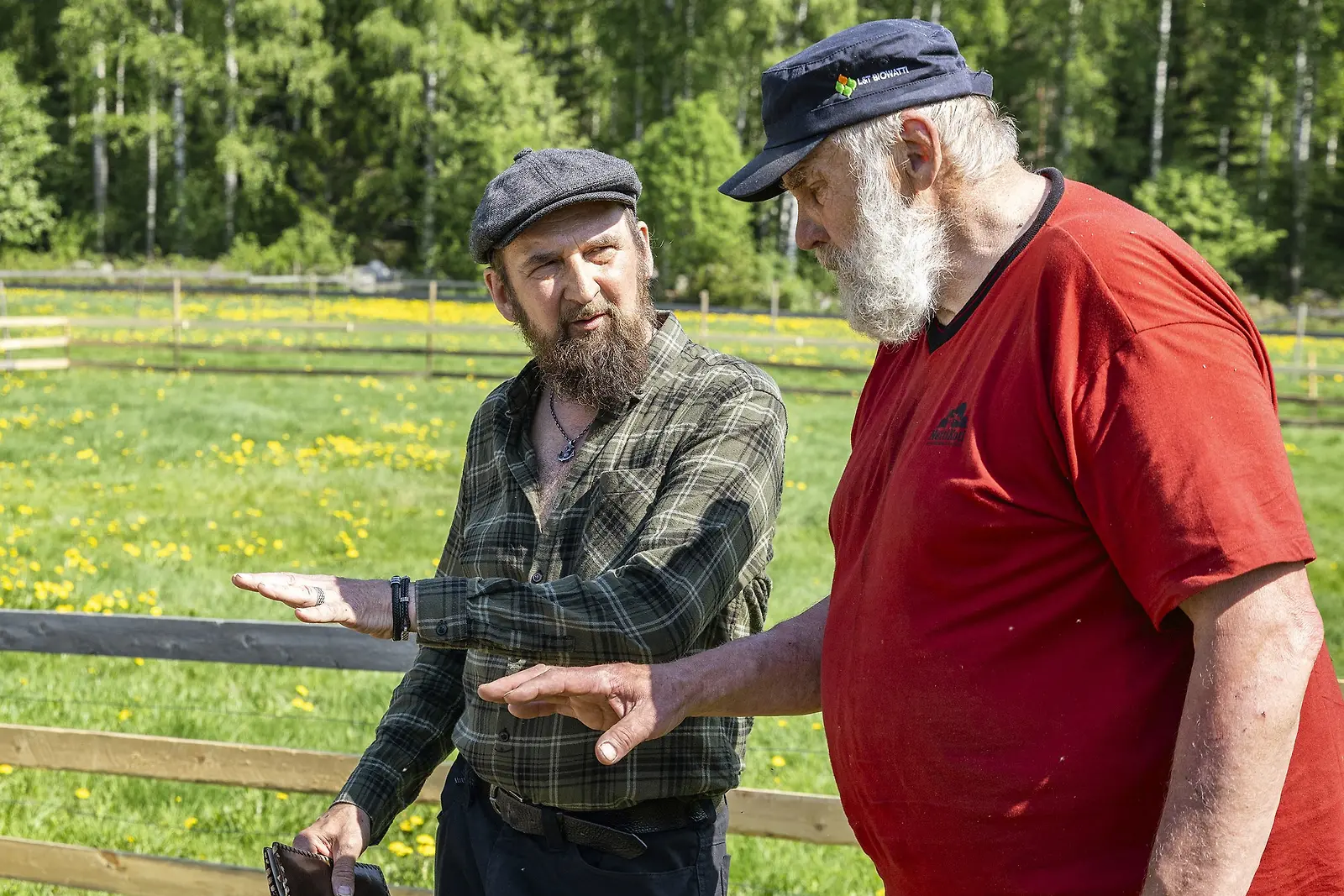 Pehtoori tapaa Farmi Suomi -kuvauksissa monenlaisia ihmisiä, toisilla on kokemusta maatilan töistä ja toisilla ei. Tässä maaseudun kasvatti Juha Mieto ja Terho-pehtoori käymässä läpi tilan hommia. Kuva Alpertti Rieskjärvi, Nelonen