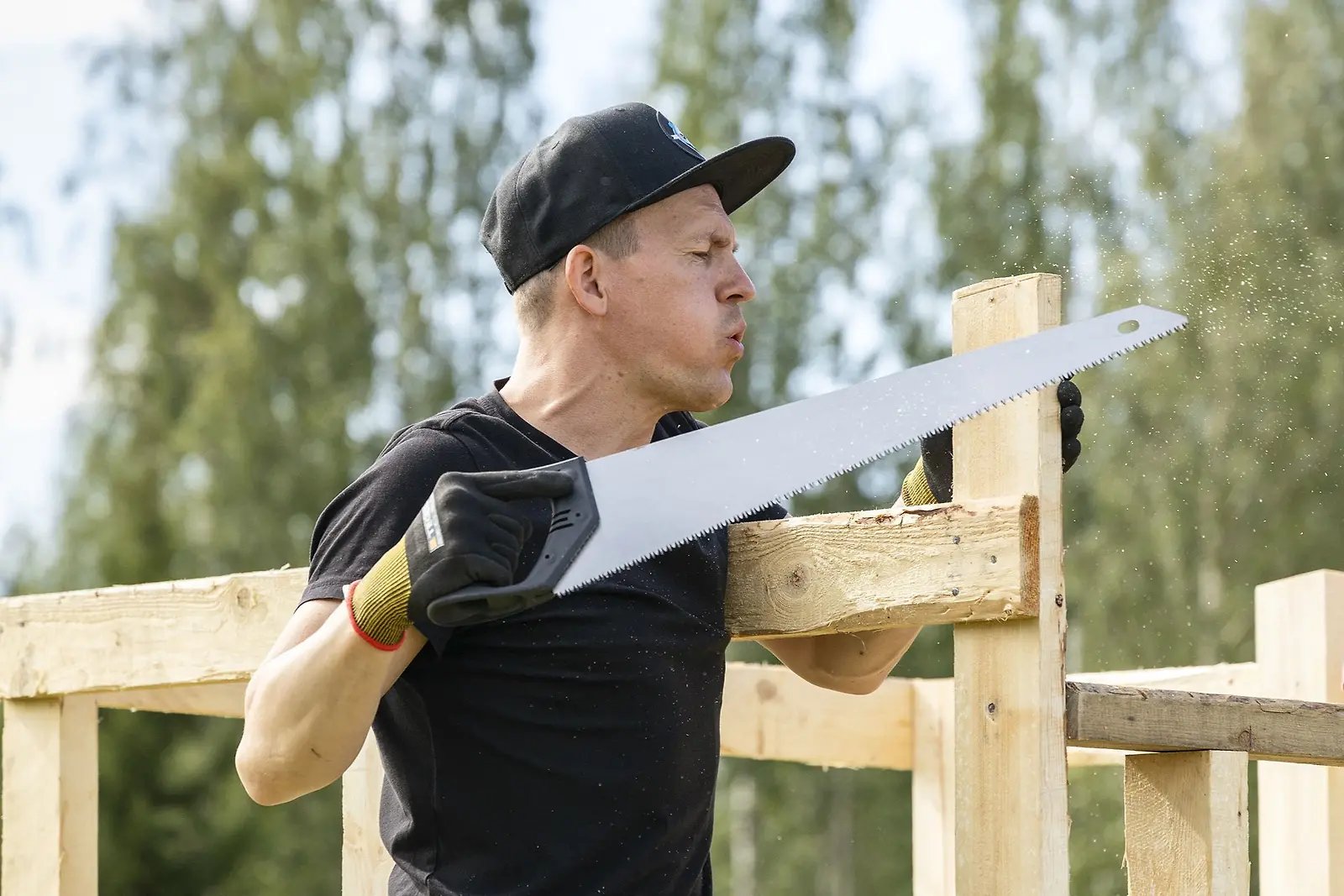 Koivun oksien karsimispuuhissa Sami Jauhojärven kanssa Miina Äkkijyrkkä, Veeti Kallio ja Merja Kyllönen. Kuva Alpertti Rieskjärvi, Nelonen