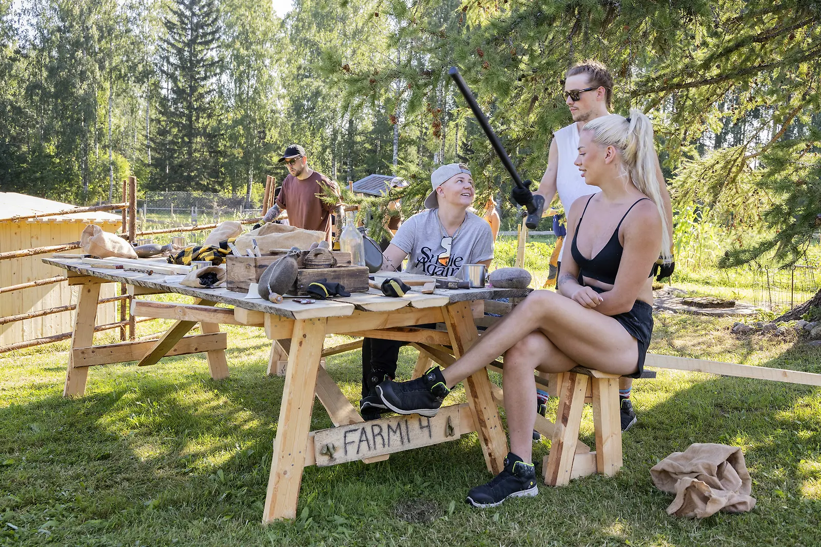 Teemu Laurell, Meri Aalto, Joona Puhakka ja Jade Nyström Farmilla. Kuva Alpertti Rieskjärvi, Nelonen