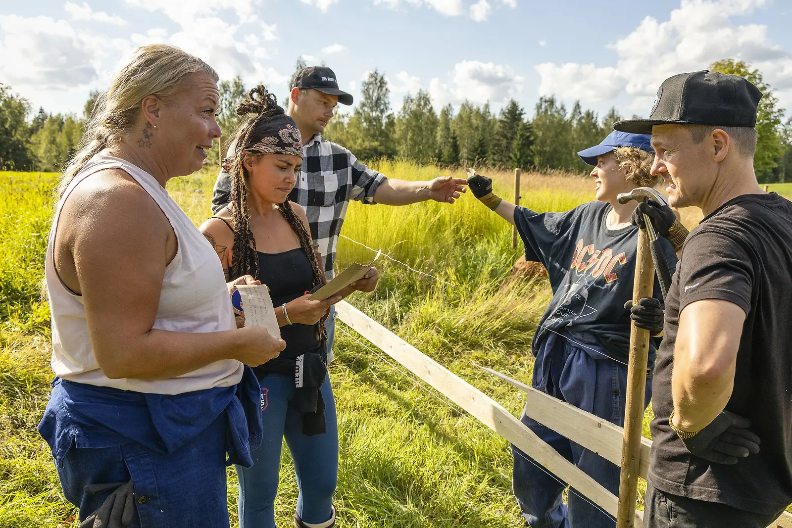 Farmilaisia aidan rakennuspuuhissa. Kuva Alpertti Rieskjärvi, Nelonen