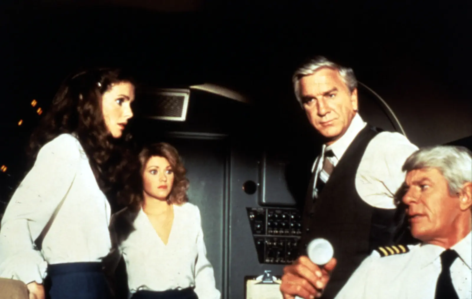 Elaine Dickinson (Julie Hagerty), Barry Rumack (Leslie Nielsen) ja lentokonehenkilökuntaa kriittisessä tilanteessa. Kuva: Hero.