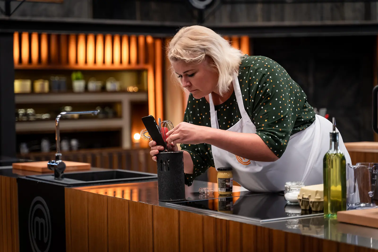 Minna Kuukka keskittyy ankarasti MasterChef VIP -kisakeittiössä. Kuva: MTV3