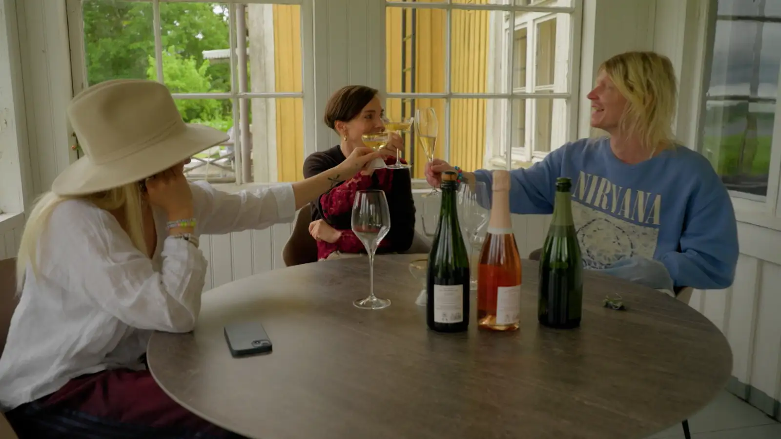 Roosbergien luona viiniä on tarjolla pitkin päivää. Kuistilla keskusteluhetkessä tarjolla on viiniä ja kuohuvaa. Viineissä ei nuukailla, sillä pulloja on peräti kolme pöydällä.