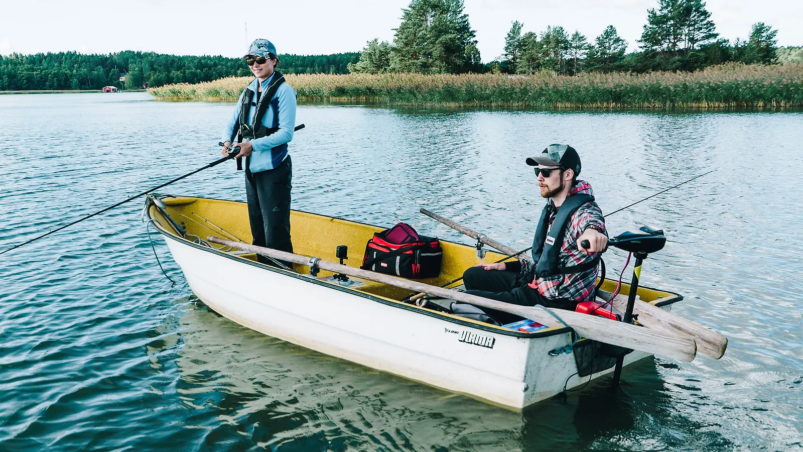 Yifeng Li ja Juuso Huhtala kalastushommissa. Kuva: Jani Honkakoski / NTRNZ media Oy / Yle Kuvapalvelu