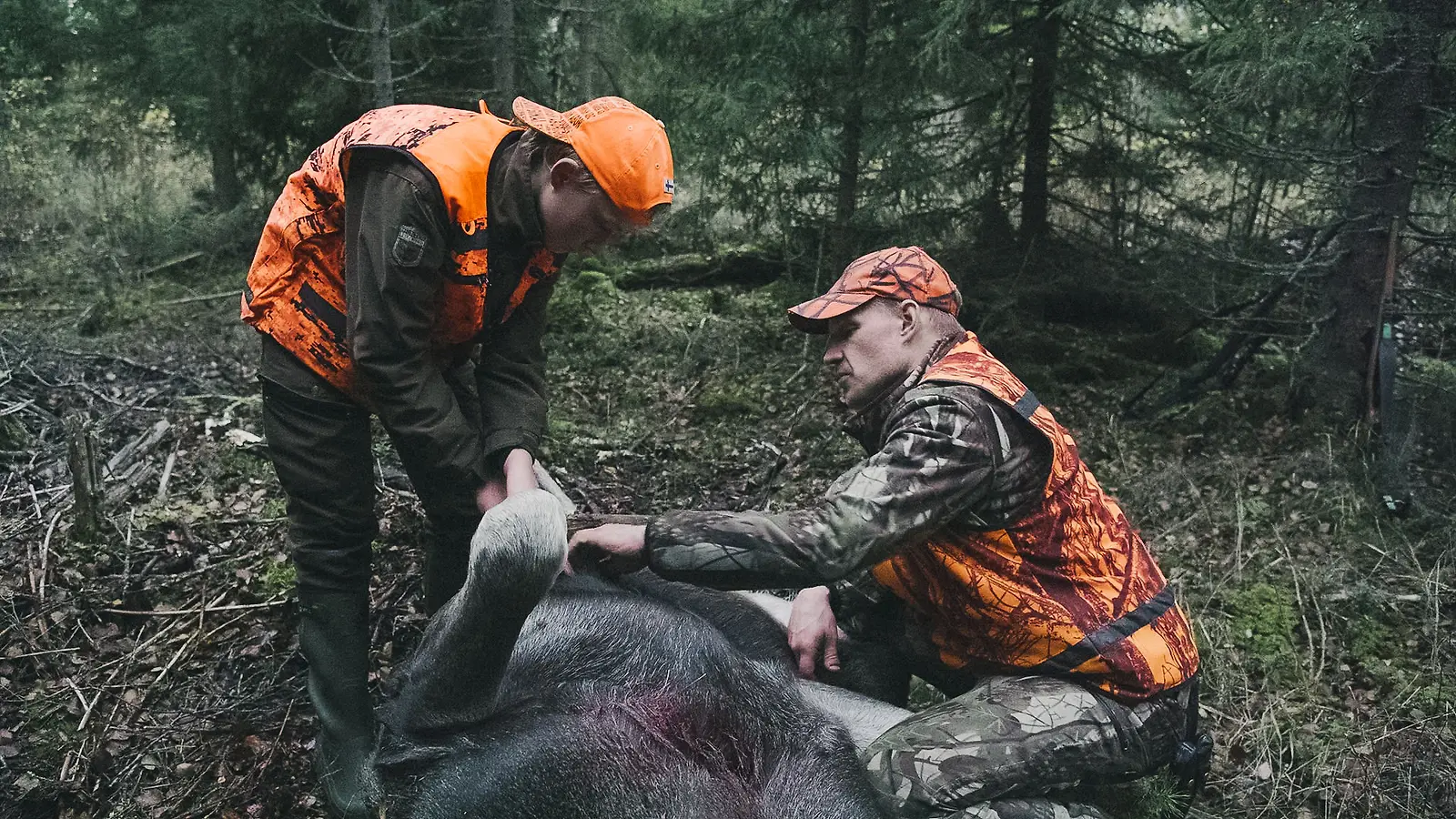 Paavo Lehtomäki suolistaa ensimmäistä itsenäisesti pyytämäänsä hirveä. Kuva: NTRNZ media Oy / Yle Kuvapalvelu