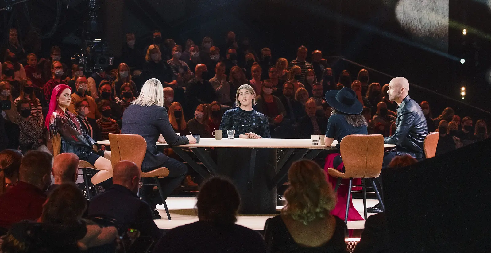 Artistit kokoontuvat pöydän ääreen muistelemaan menneitä. Tässä Sami Kurosen kanssa Sanni, Robin, Jannika B ja Juha Tapio. Kuva: Nelonen