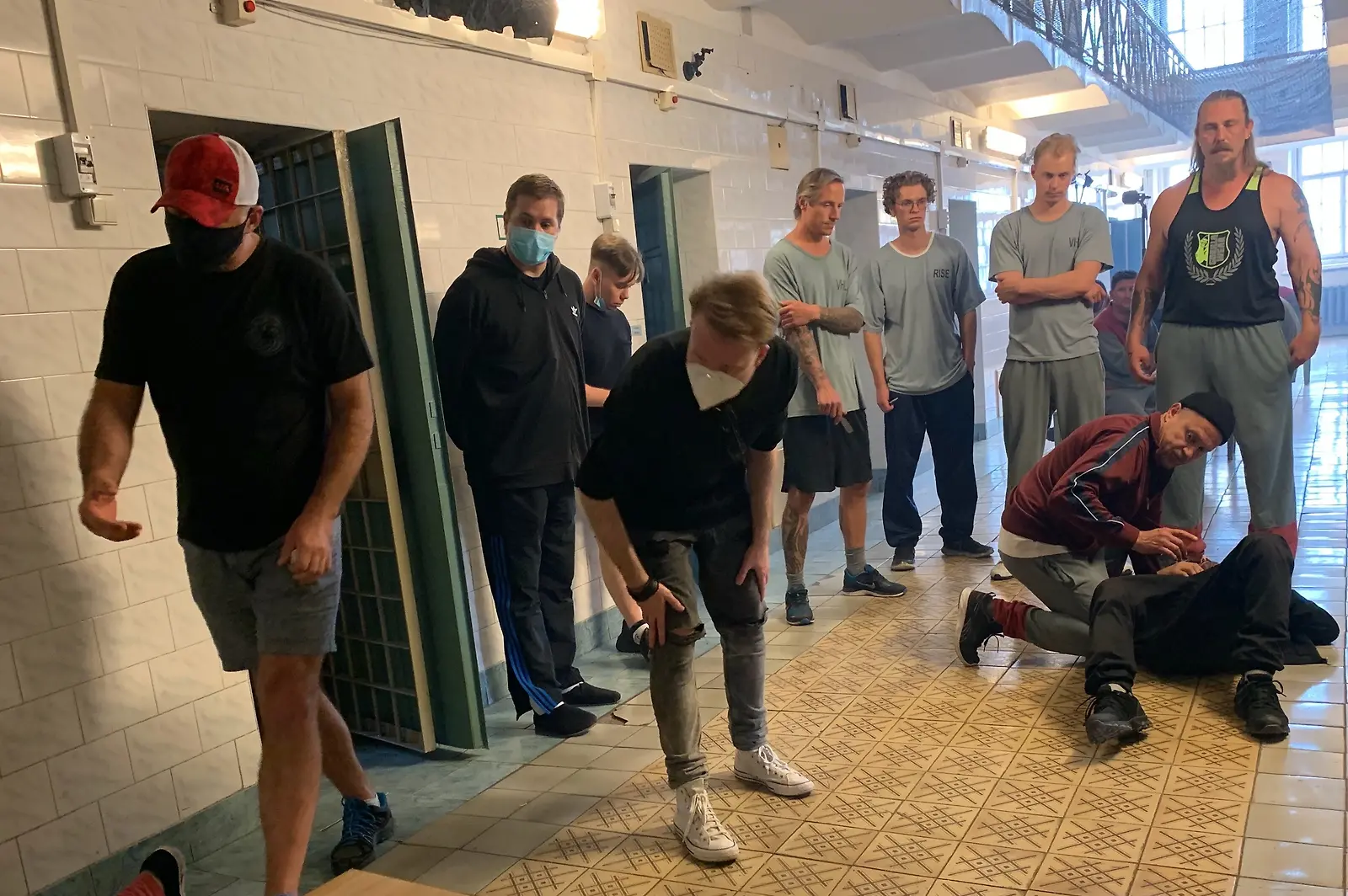 Aallonmurtaja tv-sarjaa kuvattiin Vilnassa ja Liettuassa viime syksynä. Kuvassa työryhmää ja näyttelijöitä kuvauksissa vilnalaisessa vankilassa. Kuva: Warner Bros.