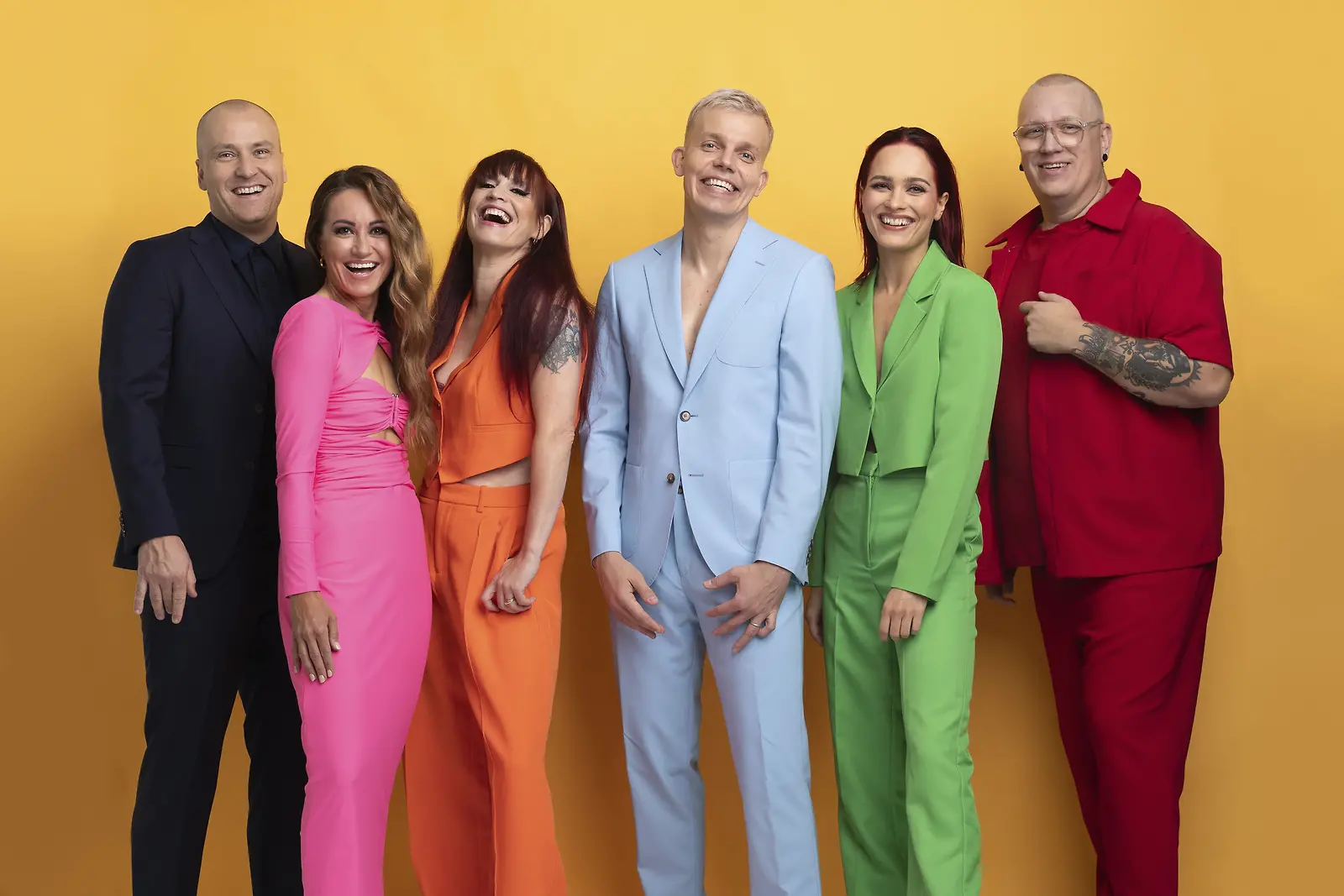 TVOF-jengi 2024: Heikki Paasonen, Jaana Pelkonen, Maija Vilkkumaa, Elastinen, SANNI ja Arttu Wiskari. Kuva: Nelonen