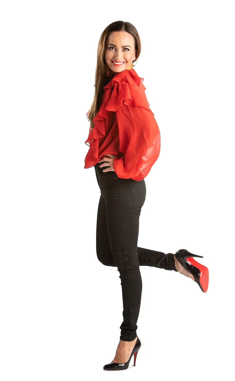 Jaana Pelkonen astuu juontajan saappaisiin, tai pikemminkin Manoloihin All Together Now Suomi -viihdeohjelmassa. Kuva: Nelonen