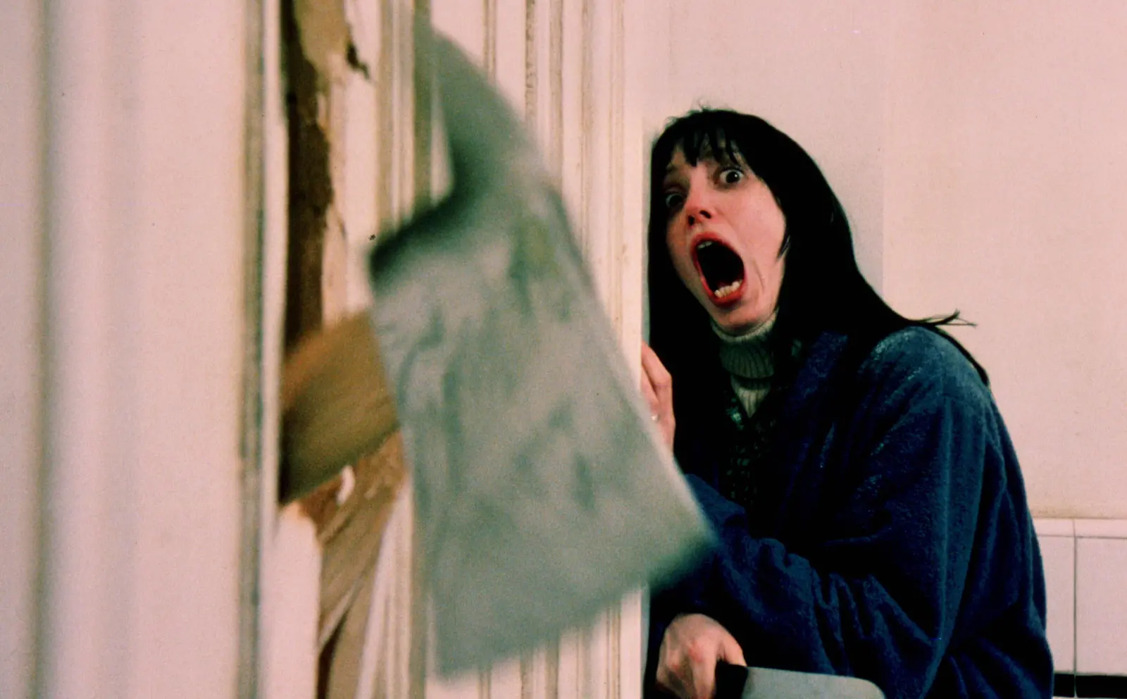 Ikoninen kuva Hohto-elokuvasta, piinassa Wendy-äiti (Shelley Duvall). Sub