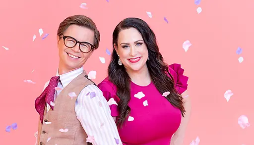 Morsianten hääpukumentoreina toimivat muotiguru Sami Sykkö ja pitkän linjan hääpukuammattilainen Niina Kuhta. Kuva: TV5.