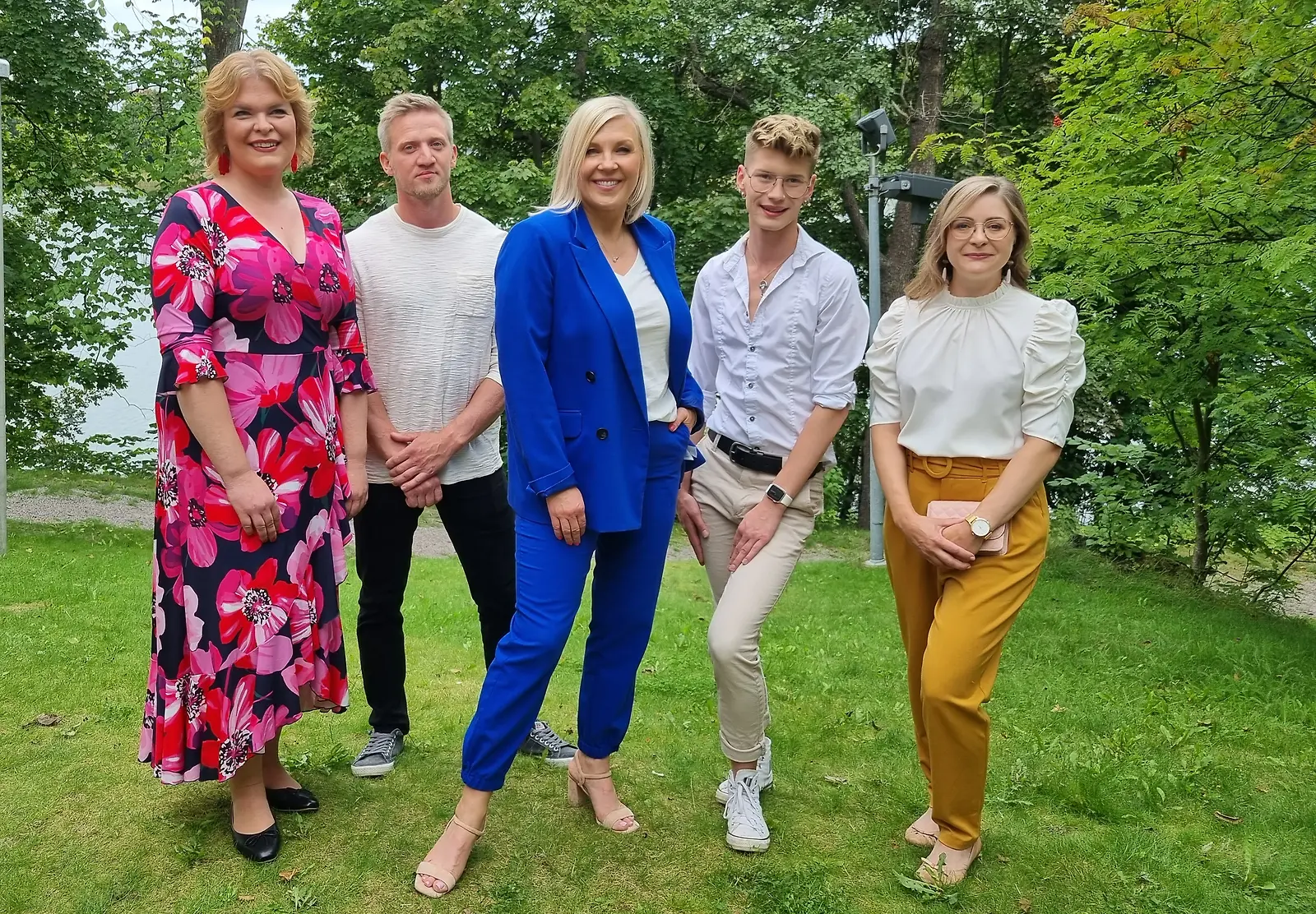 Maajussille morsian: Kaikki tarinat -sisarsarja keskittyy pääsarjasta rannalle jääneisiin maajusseihin. Viime vuonna mukana olivat Aino, Veli-Matti, Jani ja Pinja. Keskellä ohjelman juontaja Vappu Pimiä. Kuva: MTV3