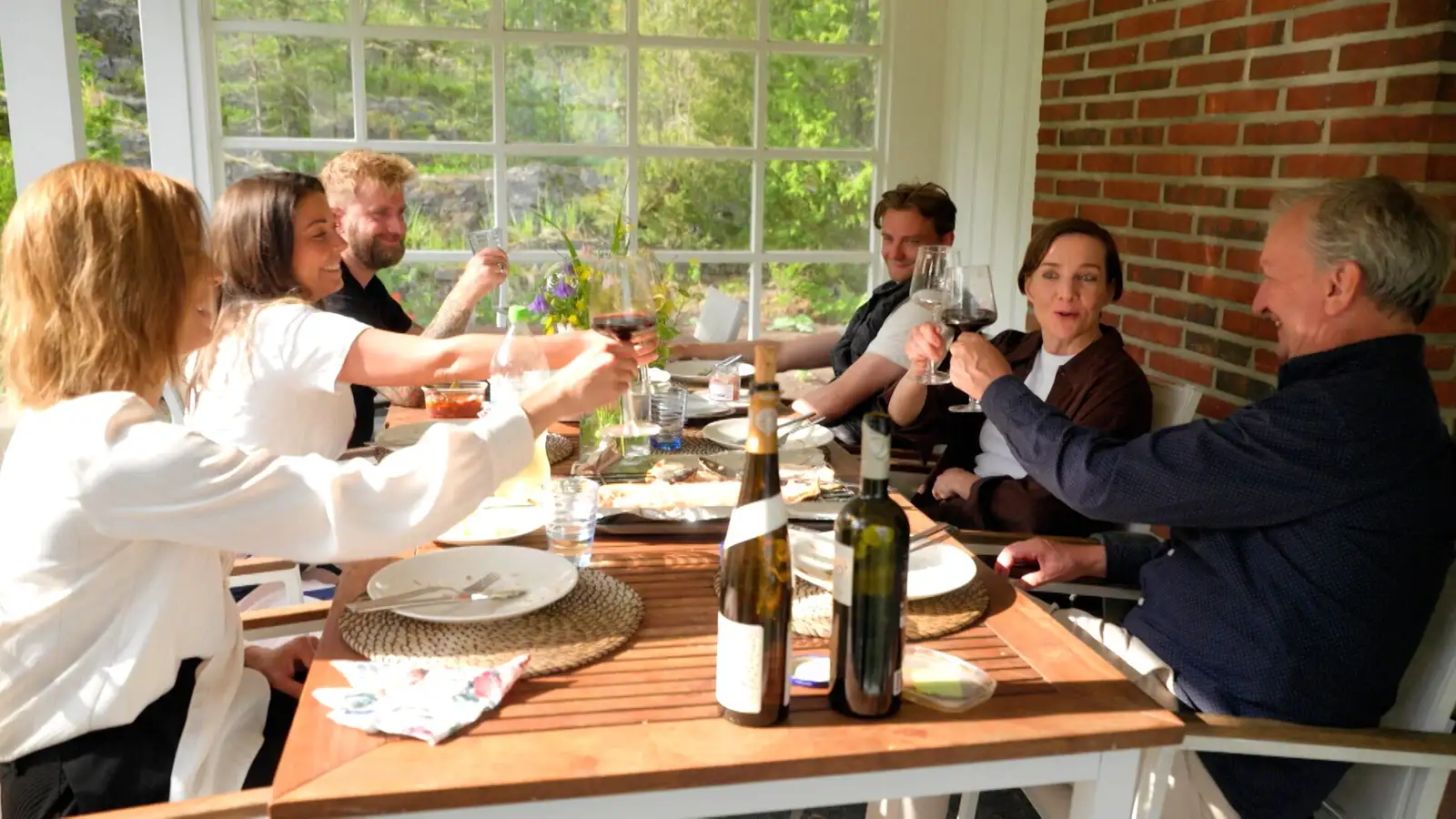 Harkimot ja Maria Veitola kippistelevät ruokapöydässä. Kuva: MTV3