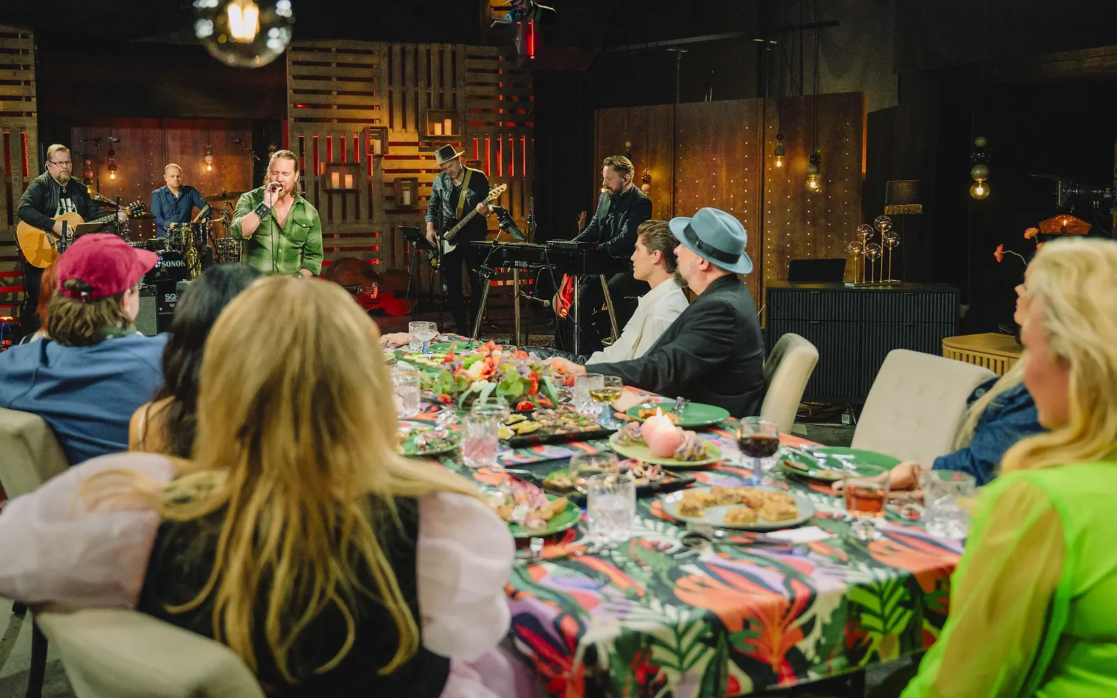 Jouni Hynynen laulaa Mari-rakkaalleen Vain elämää -ohjelmassa, Mari Hynynen kuvassa oikealla pöydän päässä. Kuva: Nelonen