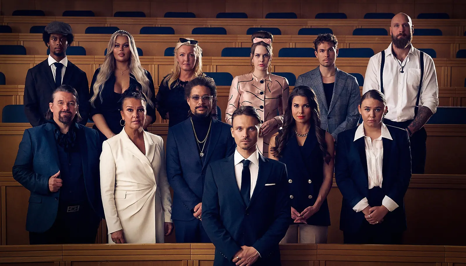 Juontaja Roope Salminen ja Myyrä-osallistujat v. 2024: näyttelijä ja laulaja Aaron Bojang, mediapersoona Henny Harjusola, näyttelijä Mari Perankoski, toimittaja Ina Mikkola, tubettaja Tomas Grekov, nyrkkeilijä Robert Helenius, julkkispappi Kari Kanala, laulajalegenda Arja Koriseva, artisti Juno eli Jon Korhonen, malli ja juontaja Viivi Pumpanen sekä näyttelijä Linnea Skog. Kuva: MTV3