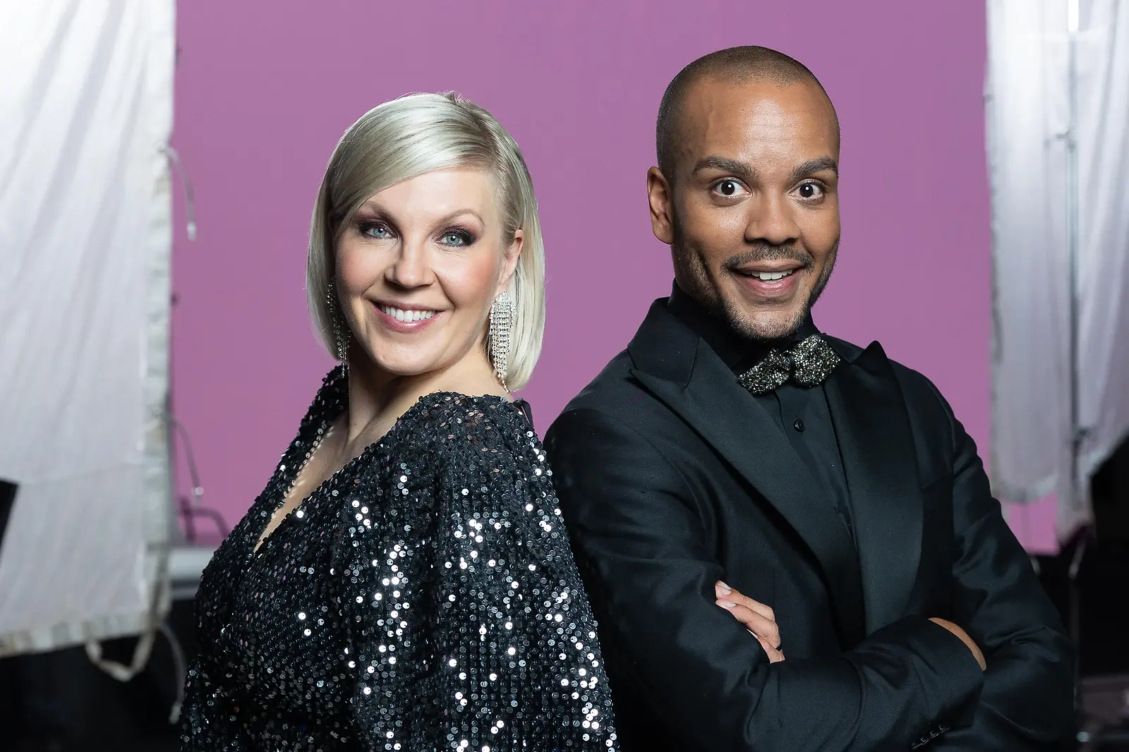 Vappu Pimiä ja Ernest Lawson juontajat Tanssi Tähtien Kanssa -suosikkiohjelmaa. Kuva: MTV3