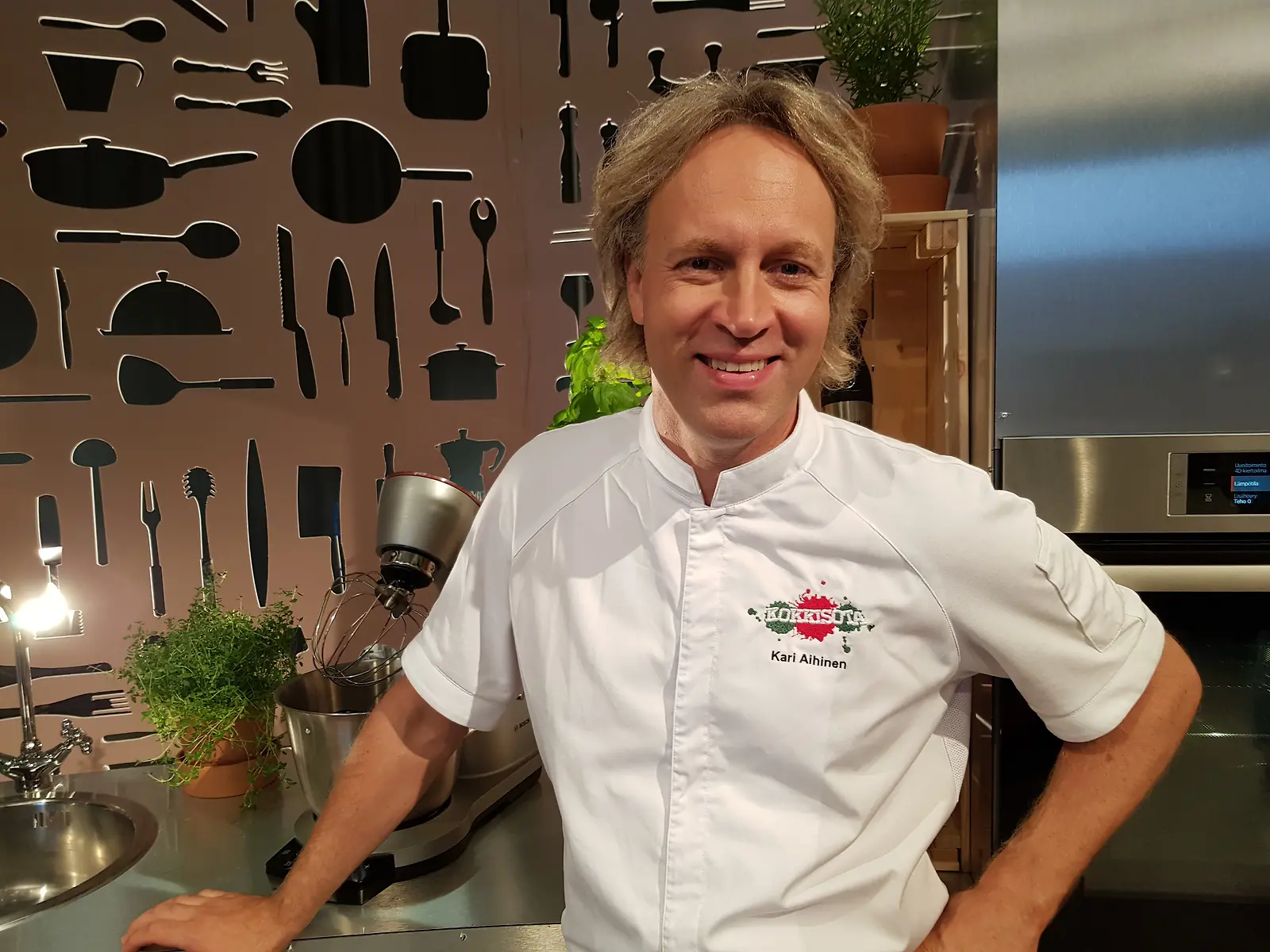 - Mansikoita rosesamppanja-hyytelössä oli ensimmäinen ruoka, jonka tein lapsuudenkodissani Nousiaisissa. Hyytelössä oli pikkasen liikaa gelatiinia, joten mansikat nousivat samppanjalasissa pintaan ja loppu oli hyytelögelatiinia. Not so good, not so good, huippukokki Kari Aihinen naurahtaa.