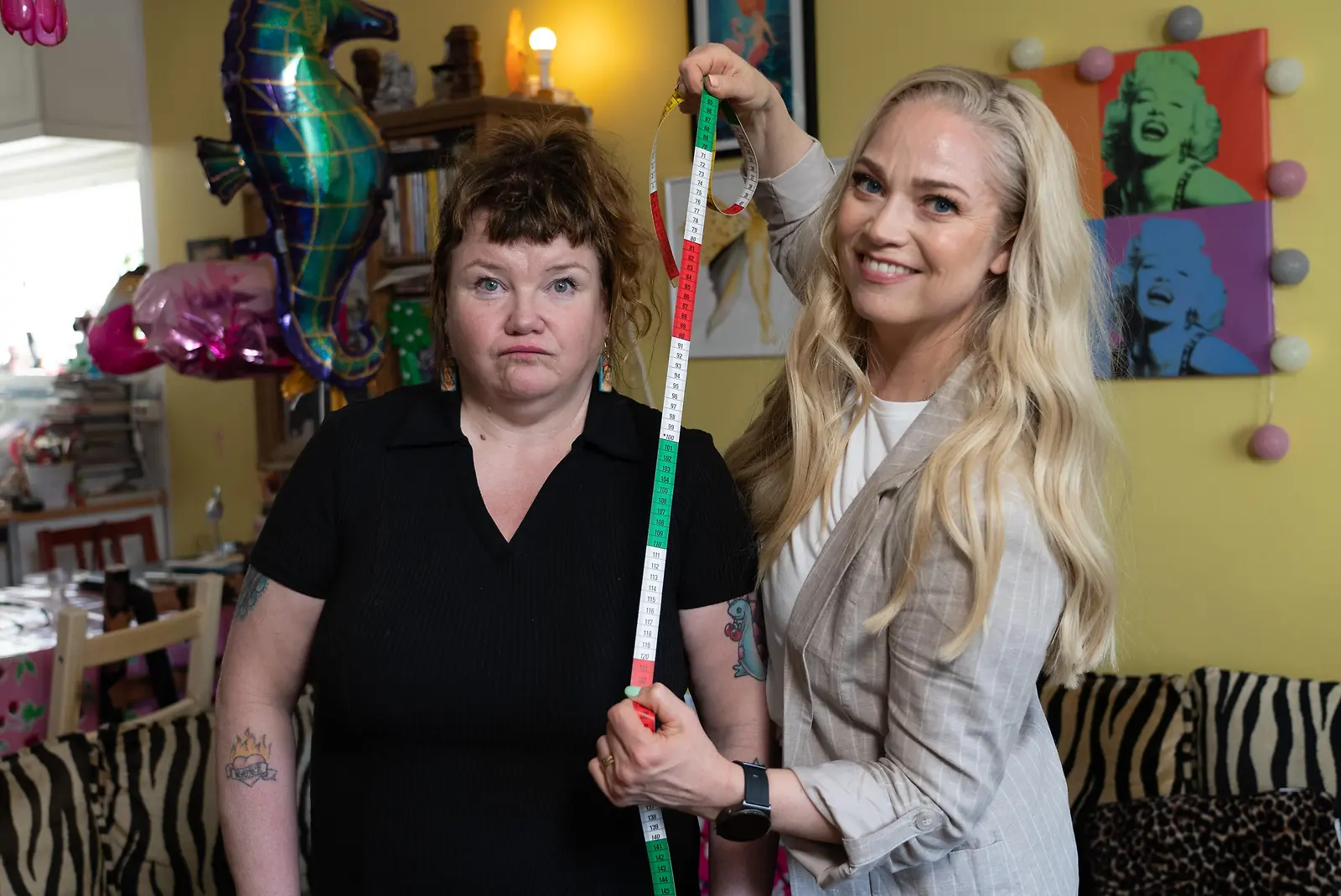 Pippa Laukka auttaa suomalaisia elämäntaparemontissa Olet mitä syöt -ohjelmassa. Tässä Minna Kivelän kanssa mittauspuuhissa. Kuva: MTV3