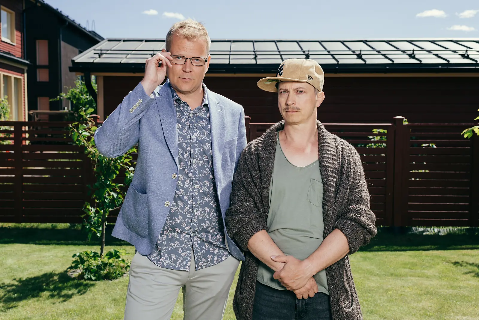 Naapurukset: Tommi (Antti Luusuaniemi) ja Juhis (Kari Ketonen). Kuva: Johanna Kannasmaa / Yle Kuvapalvelu.