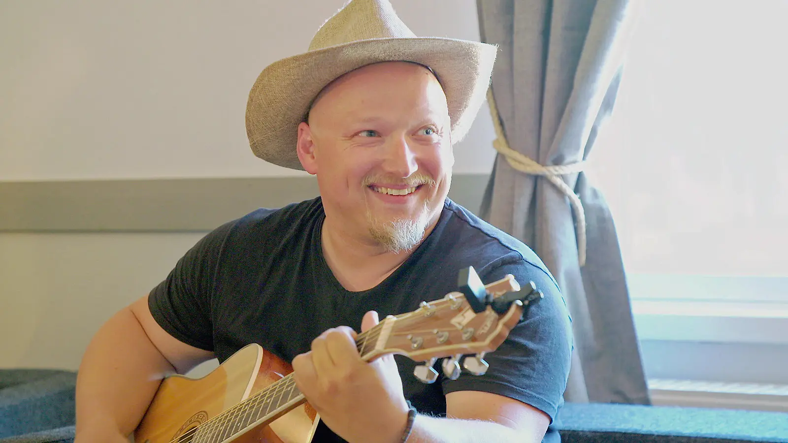 Kimmo osoittautu varsinaiseksi soittaja- ja laulajamieheksi. Ohjelmassa nähtiin jopa kaunis rakkauslaulu Miialle. Kuva: MTV3