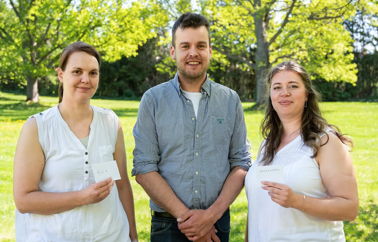 Maajussi-Samuli ja farmiviikolle saapuneet morsioehdokkaat Kiia ja Oleksandra. Kuva: MTV3