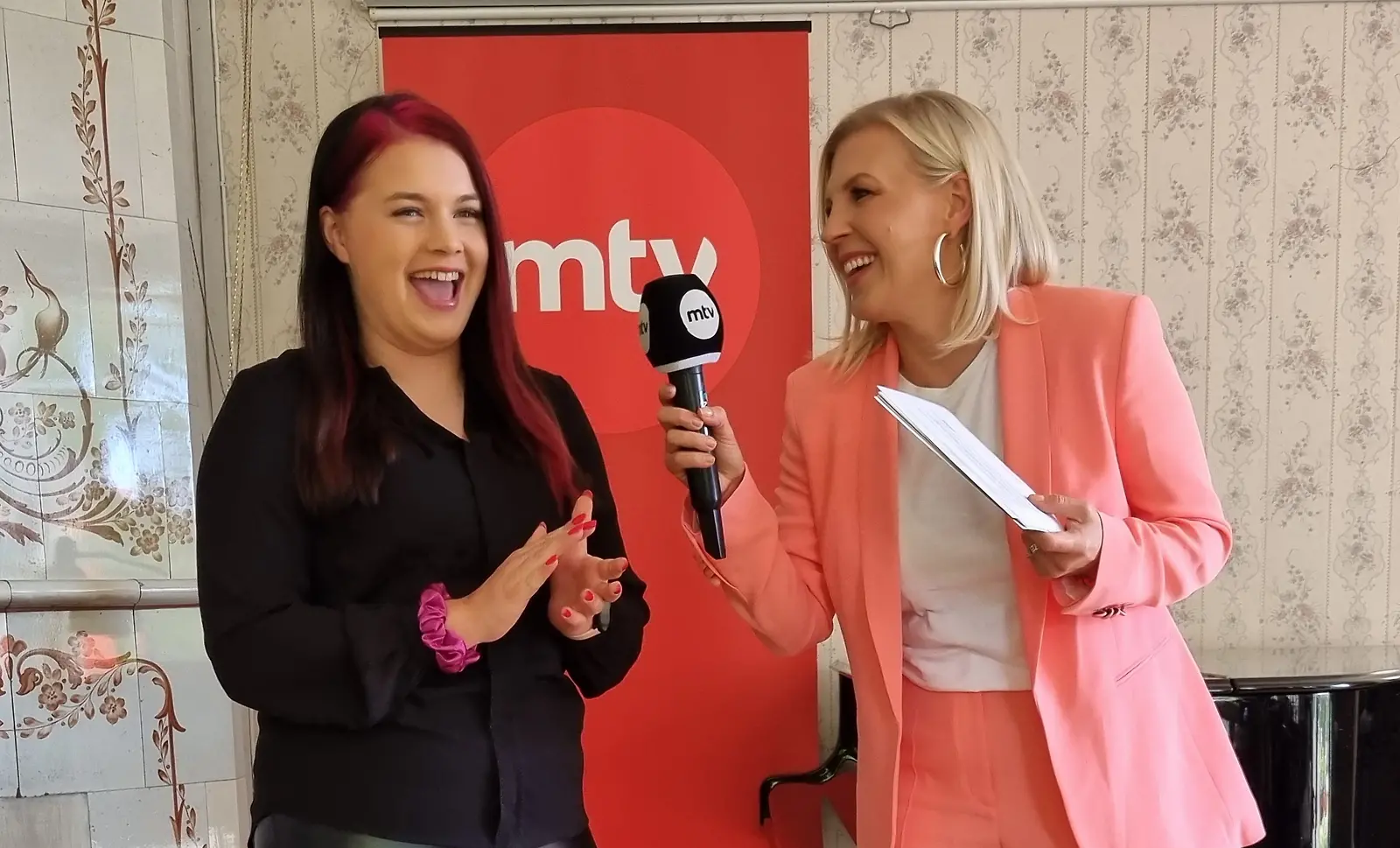 Maajussi-Jenni ja juontaja Vappu Pimiä hyväntuulisina Maajussille morsian -lehdistötilaisuudessa elokuussa. Kuva: K. Kurki
