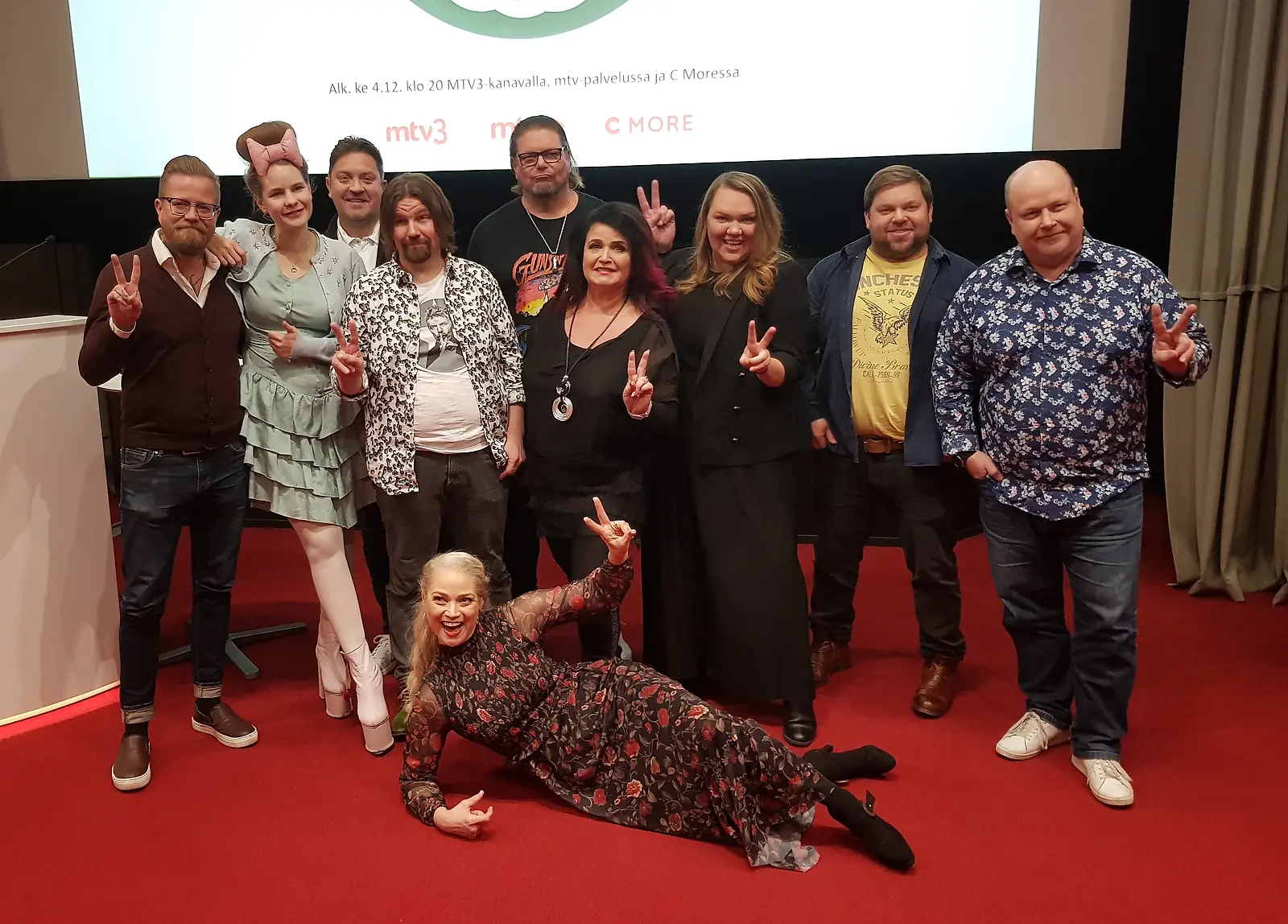 Wallu Valpio, Ina Mikkola, Oskari Katajisto, Kari Kanala, Henry Saari, Meiju Suvas, Veera Biance, Mikko Töyssy ja Riku Suokas, edessä Pippa Laukka ohjelman lehdistötilaisuudessa. Kuva: K. Kurki