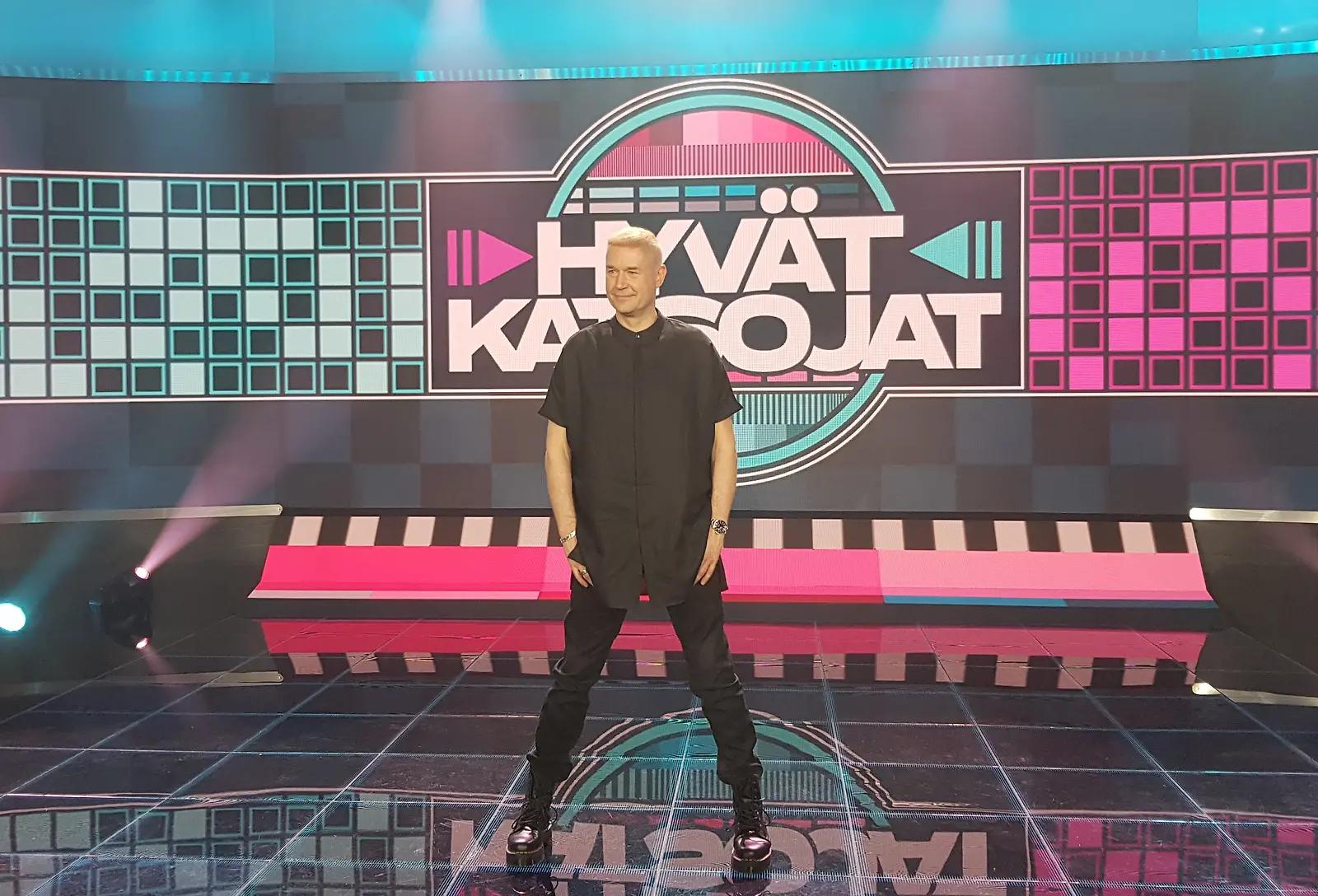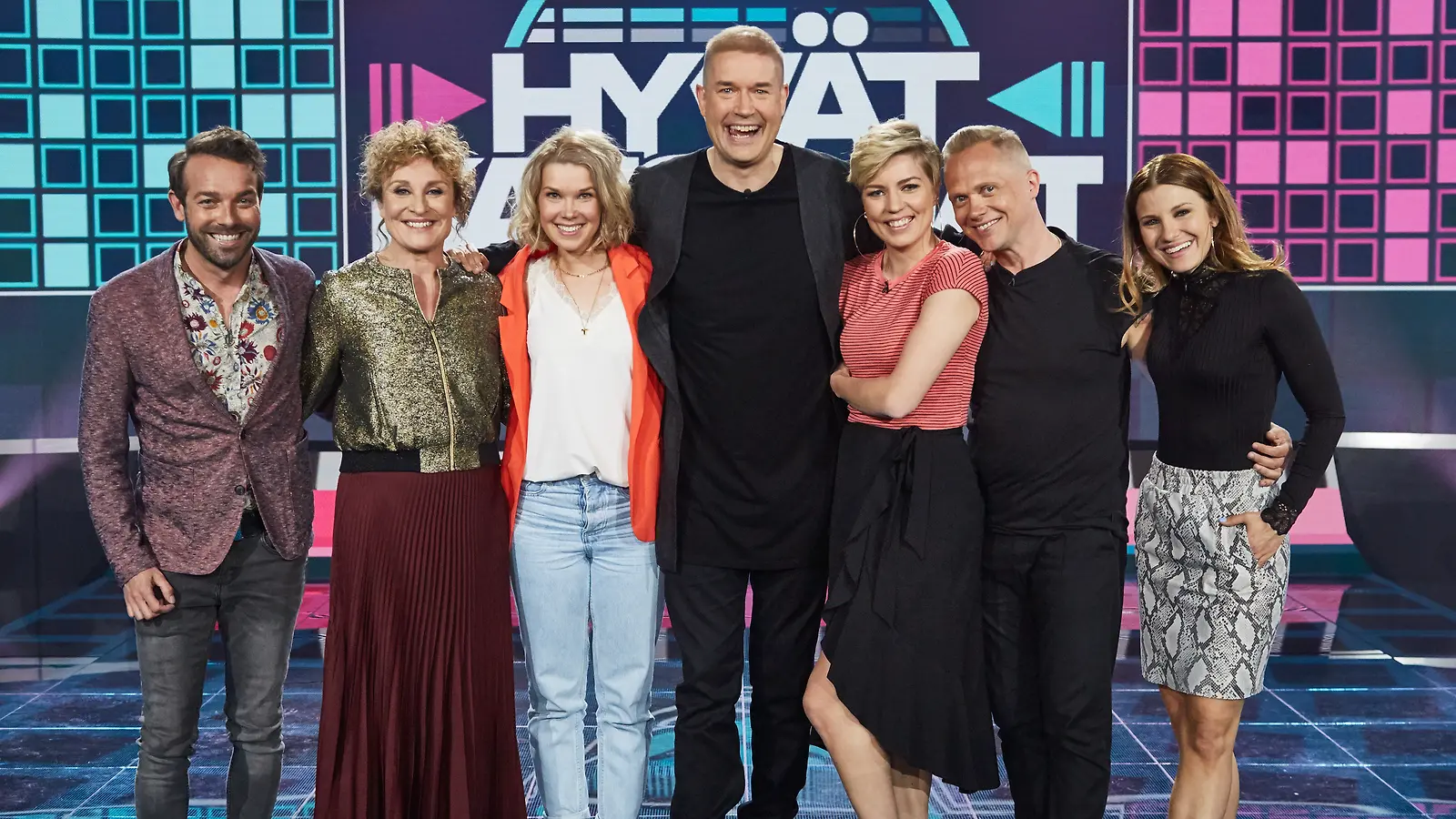 Marco Bjurströmin vetämä Hyvät katsojat tuo kolmehenkiset tiimit kisailemaan. Viikoittain vaihtuvissa joukkueissa nähdään sekä nousevia tähtiä että pitkän linjan tekijöitä. Kuva: K. Kurki