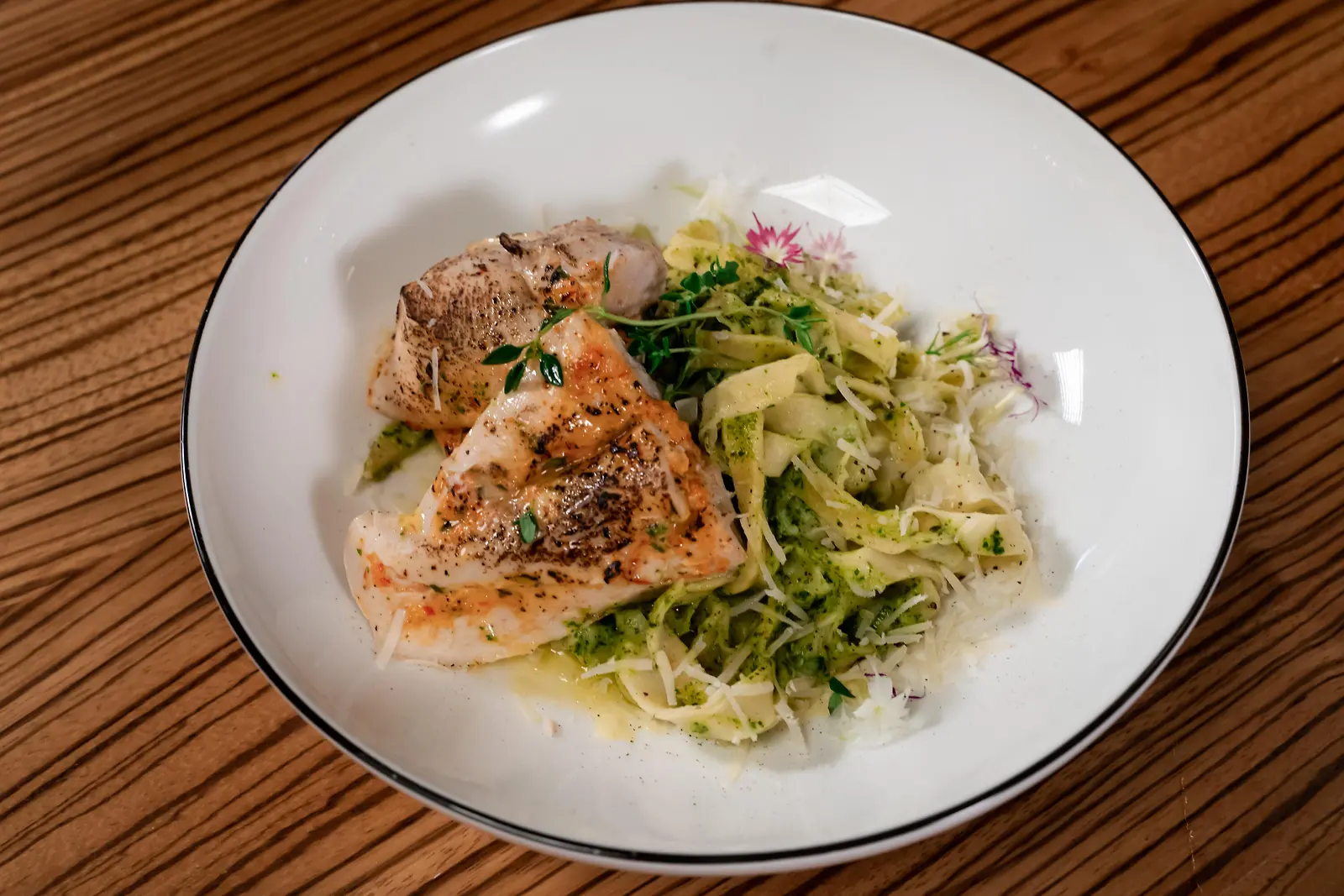 MasterCher Vip -voittaja Minna Kuukan valmistama pääruoka oli sous vide -kypsennettyjä täytettyjä broilerin rintafileitä itse tehdyn yrttisen fetapastan kera. Kuva: MTV3