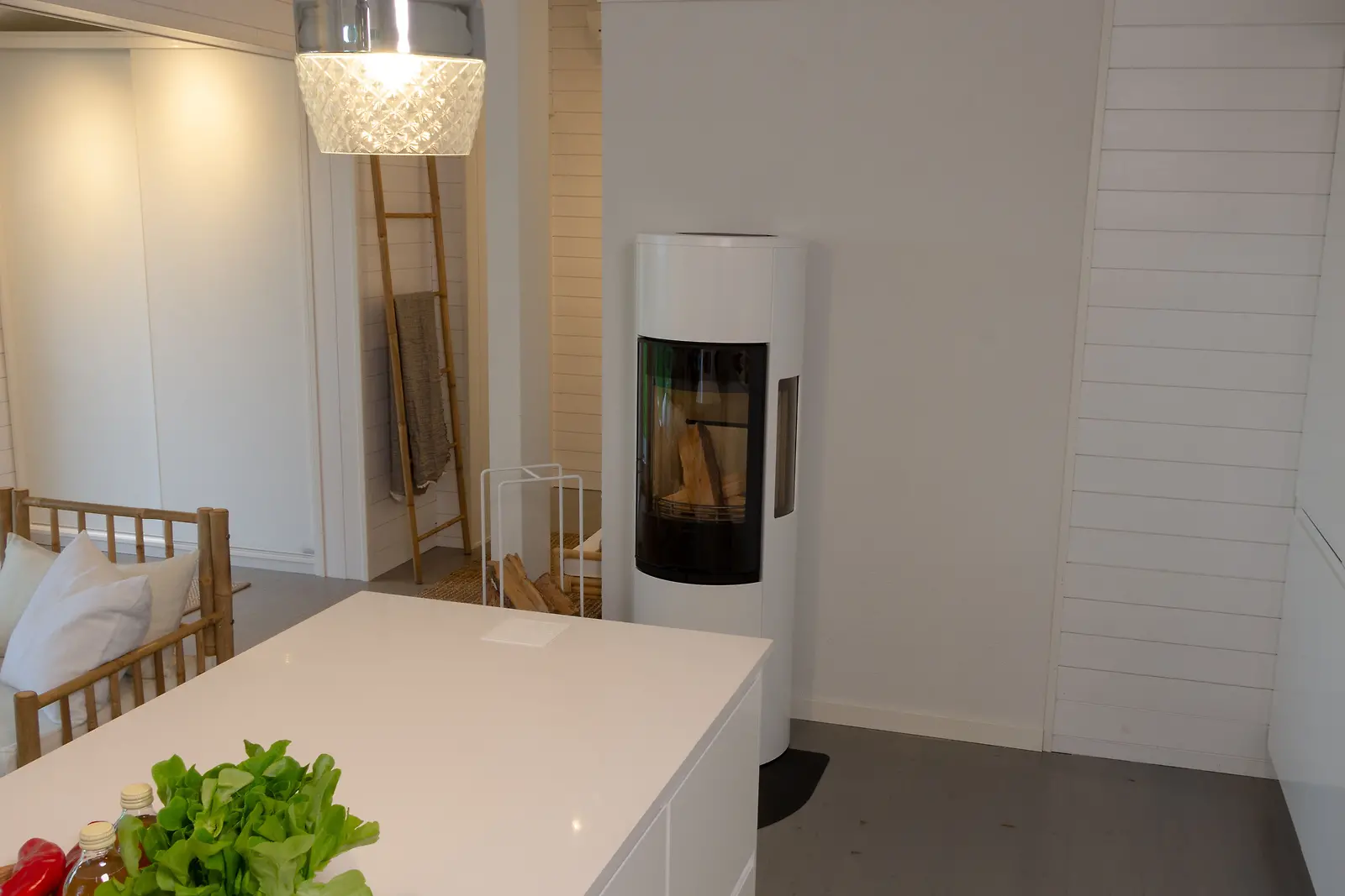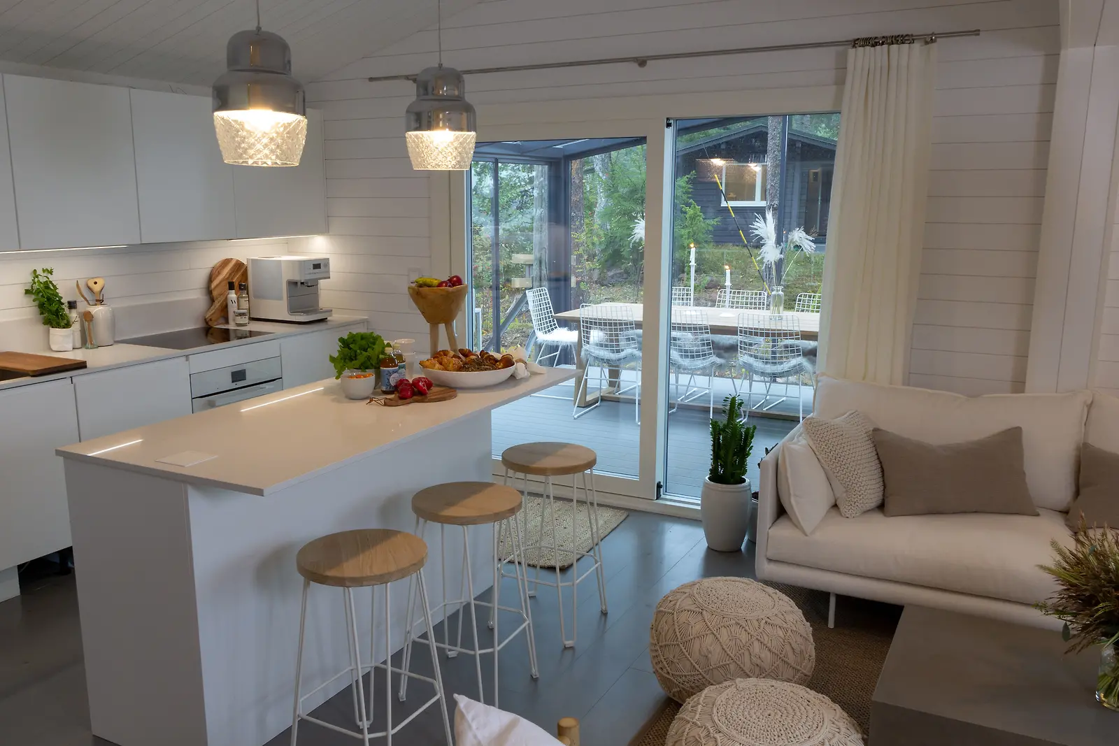 Vaaleat pinnat ja kalusteet avartavat sisätilaa reilusti ja tuovat tilan tuntua. Nykyaikaiset kodinkoneet helpottavat arkea. Kuva: Nelonen