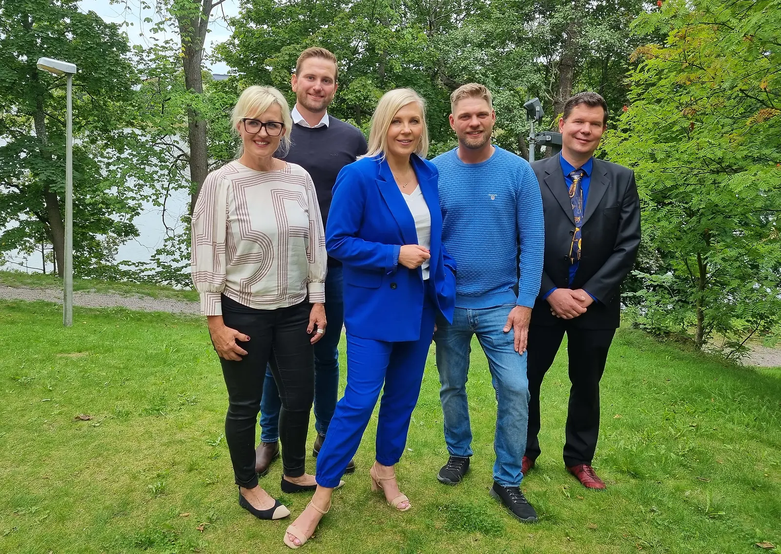 Maajussille morsian -maajussit vasemmalta Tarja, Ville, Sami ja Kalle, keskellä ohjelman juontaja Vappu Pimiä. Kuva: K. Kurki
