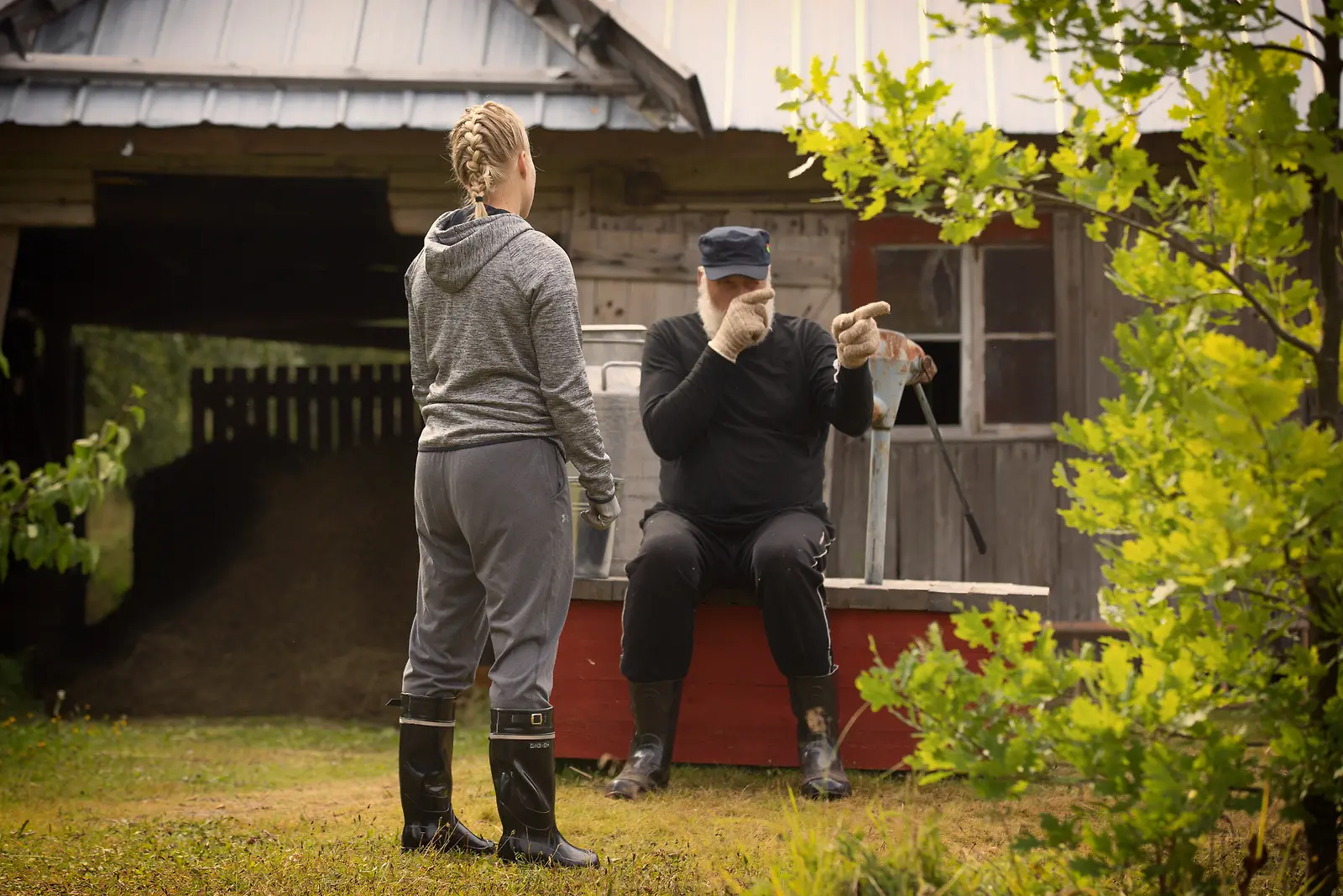 Juha Mieto ohjeistaa Noora Rätyä. Miedon ja Rädyn välillä vallitsi ns. sukupolvien välinen kuilu, eikä kommunikointi aina sujunut. Kuva: Nelonen