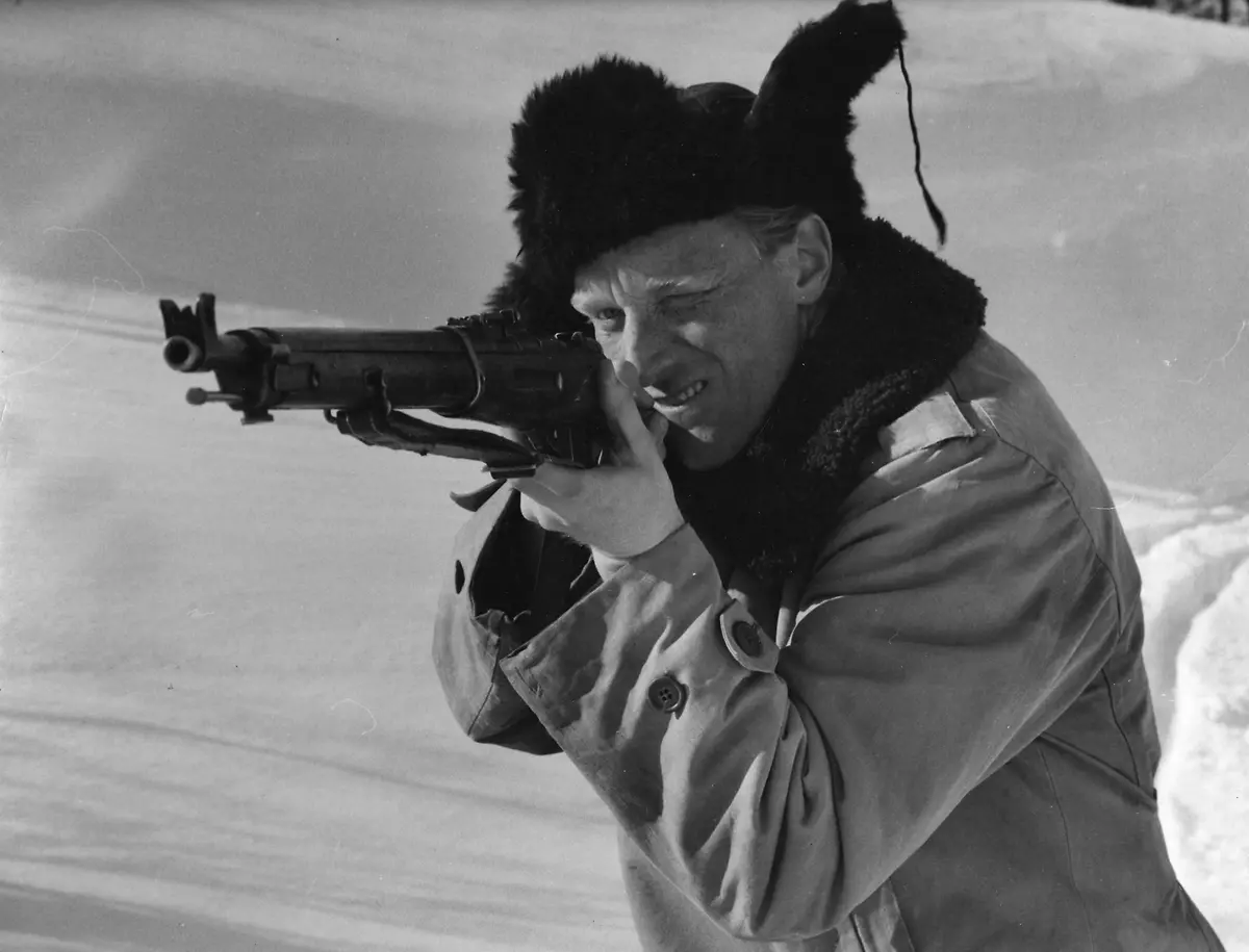Metsänhoitaja (Åke Lindman) etsii valkoista peuraa, jotta voisi ampua sen. Kuva: Elonet
