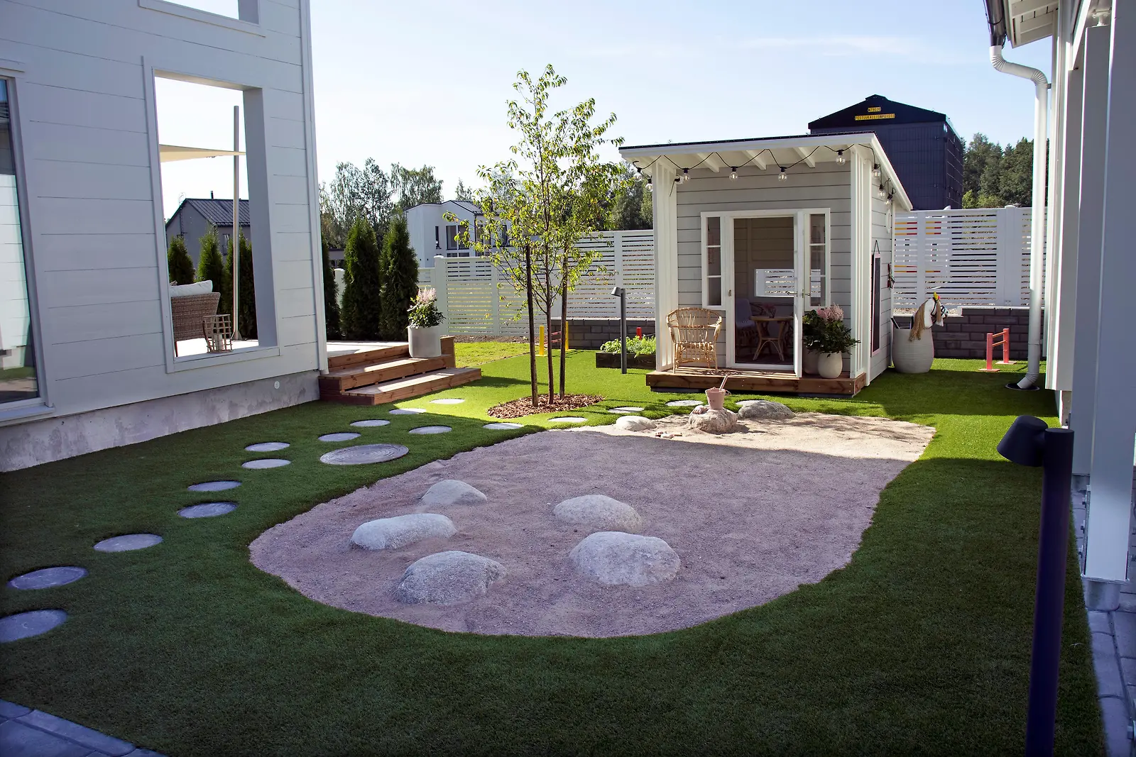 Leikkimökin eteen nurmen keskelle suunniteltiin ja toteutettiin hiekka-alue lasten leikkeihin. Kuva: MTV3