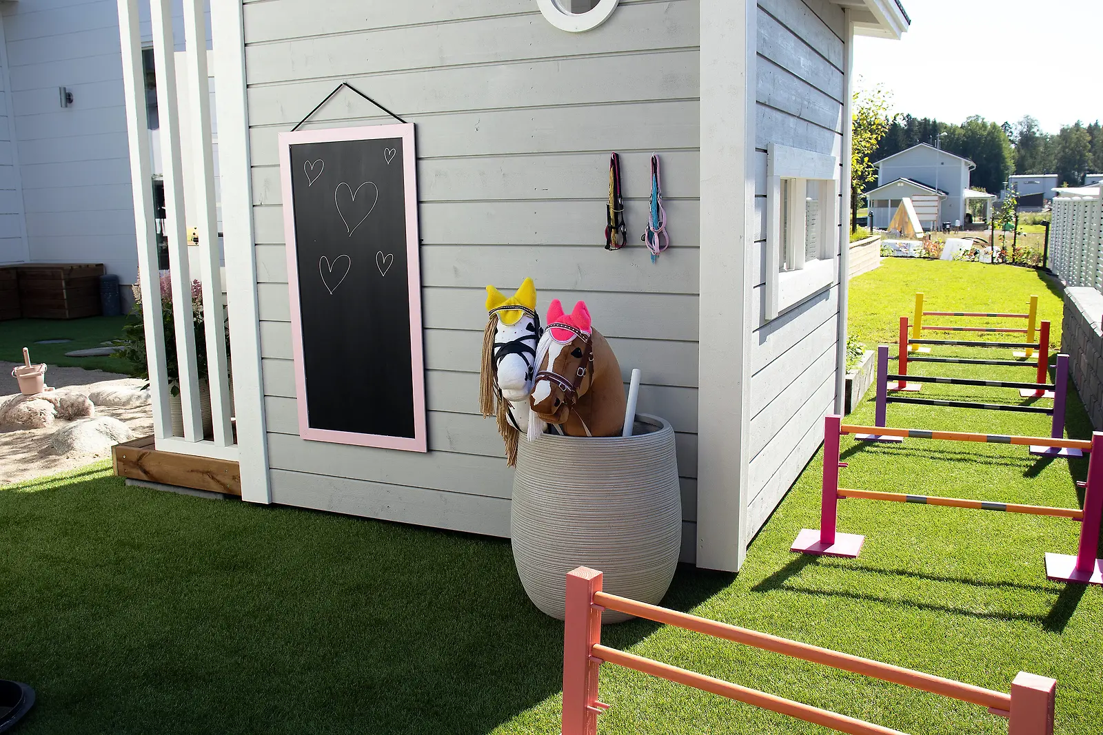 Lapset saivat oman keppihevosradan ja liitutaulun leikkimökin seinään. Keppihevoset säilyvät näyttävässä, isossa ruukussa. Kuva: MTV3