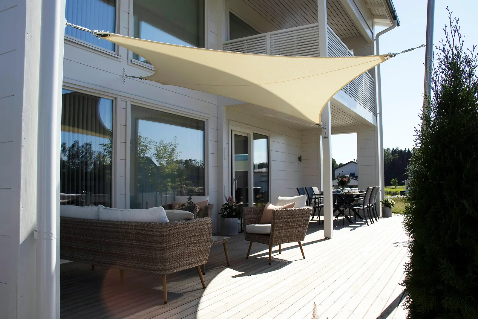 Terassi houkuttaa kesäpäivän viettoon sohvineen. Tehokas ruokailuryhmä on tarpeeksi kookas viisihenkiselle perheelle. Tuijat rajaavat terassin omaksi itsenäiseksi kokonaisuudekseen. Kuva: MTV3