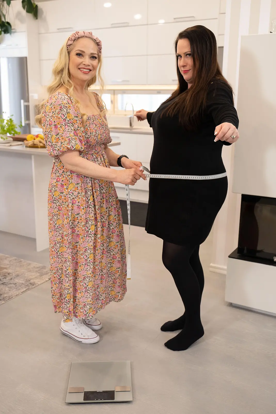 Hyvinvointilääkäri Pippa Laukka mittaa Niina Kuhdan vyötärön ympärystä. Kuva. MTV3