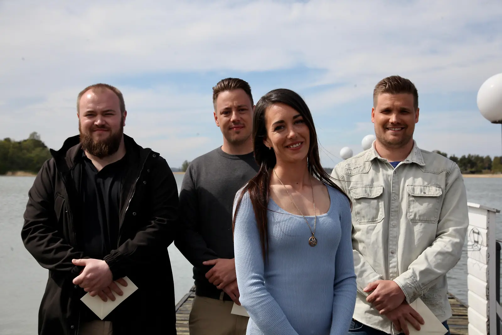 Nauravaiset maajussit ohjelman lehdistötilaisuudessa, vasemmalta Arho, Joonas, Anna-Reetta ja Victoria. Kuva: K. Kurki
